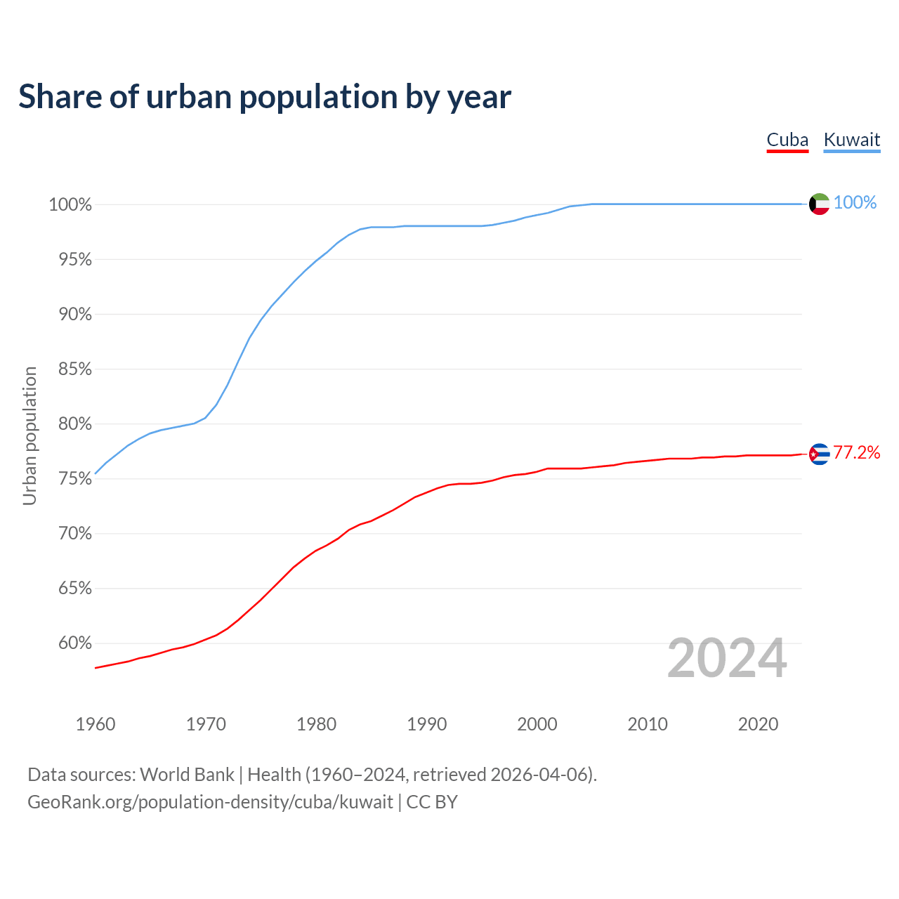 From 2004 to 2024, the share of urban population changed from 75.9% to 77.2% in Cuba and from 99.9% to 100% in Kuwait.