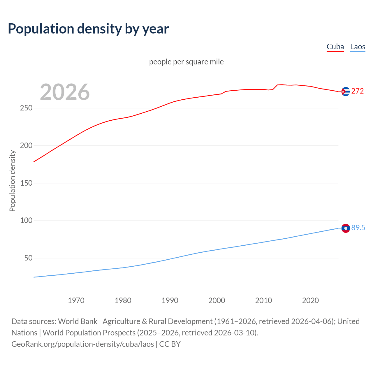 From 2006 to 2026, population density in Cuba decreased by 0.96%, compared to a 33.8% growth in Laos.
