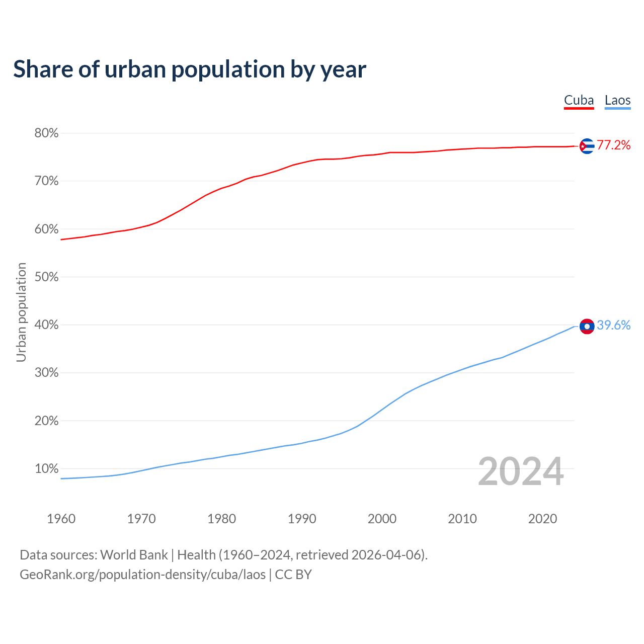 From 2004 to 2024, the share of urban population changed from 75.9% to 77.2% in Cuba and from 26.5% to 39.6% in Laos.