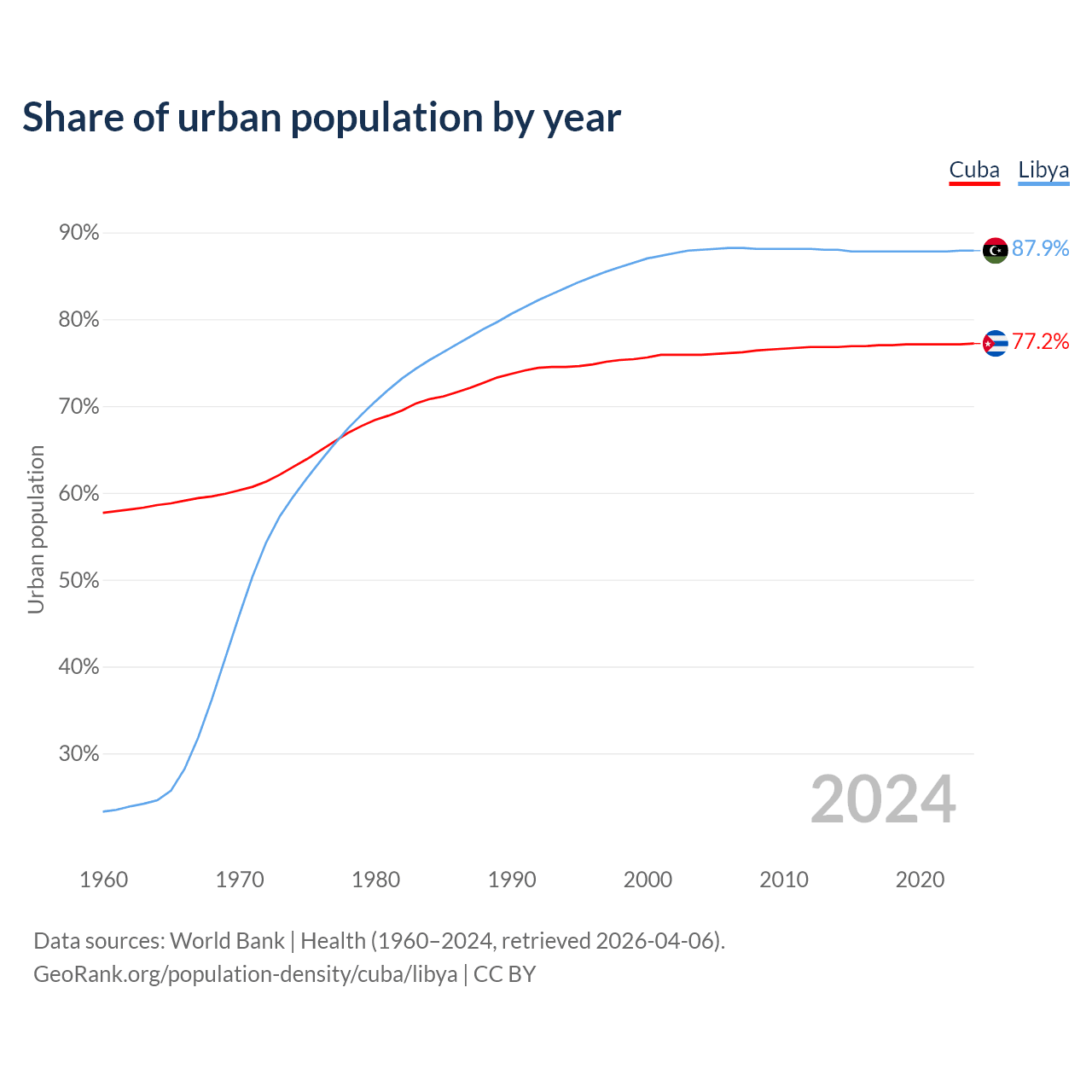 From 2004 to 2024, the share of urban population changed from 75.9% to 77.2% in Cuba and from 88% to 87.9% in Libya.