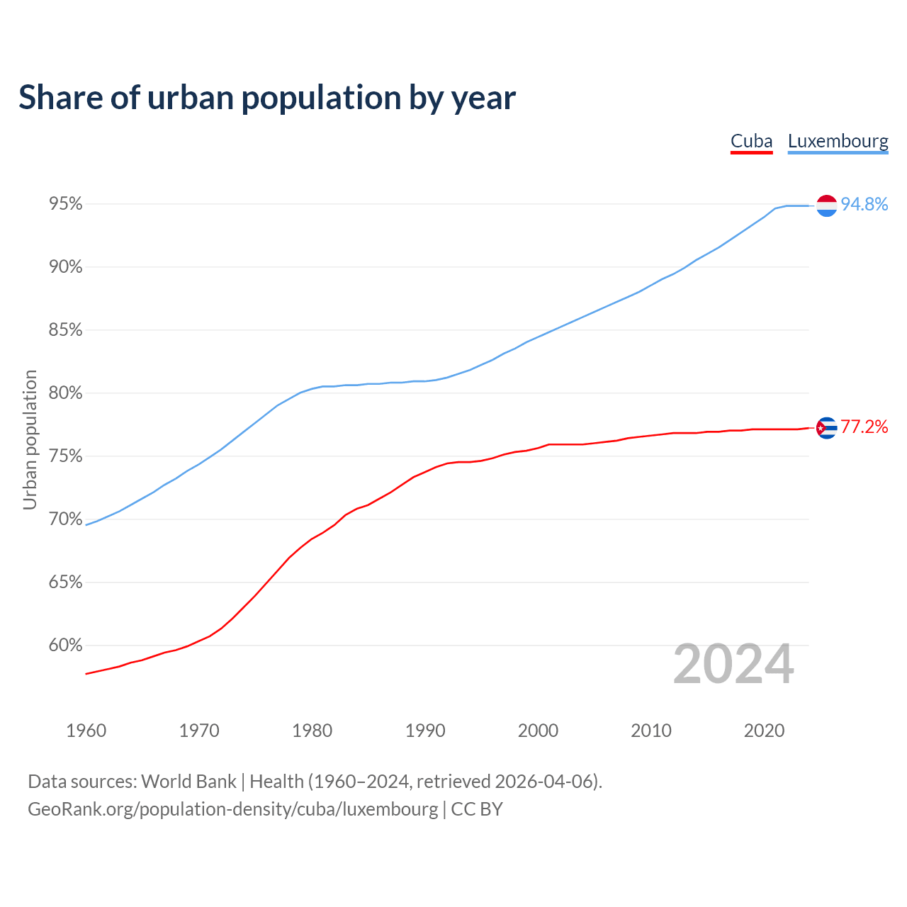 From 2004 to 2024, the share of urban population changed from 75.9% to 77.2% in Cuba and from 86% to 94.8% in Luxembourg.