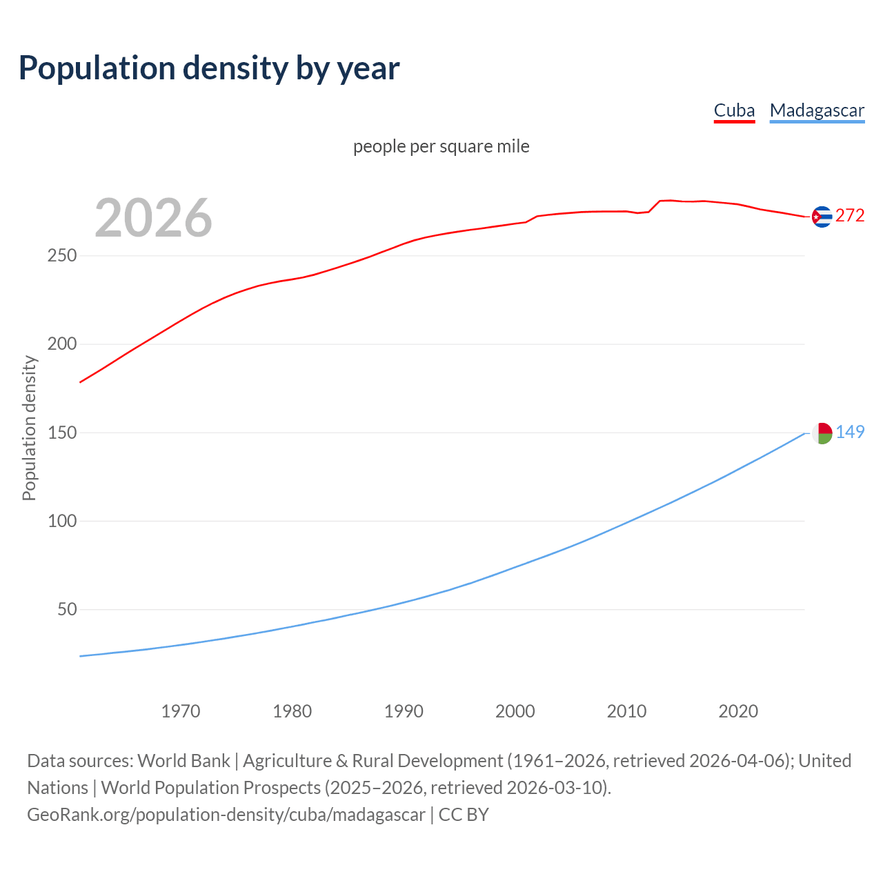 From 2006 to 2026, population density in Cuba decreased by 0.96%, compared to a 69.9% growth in Madagascar.