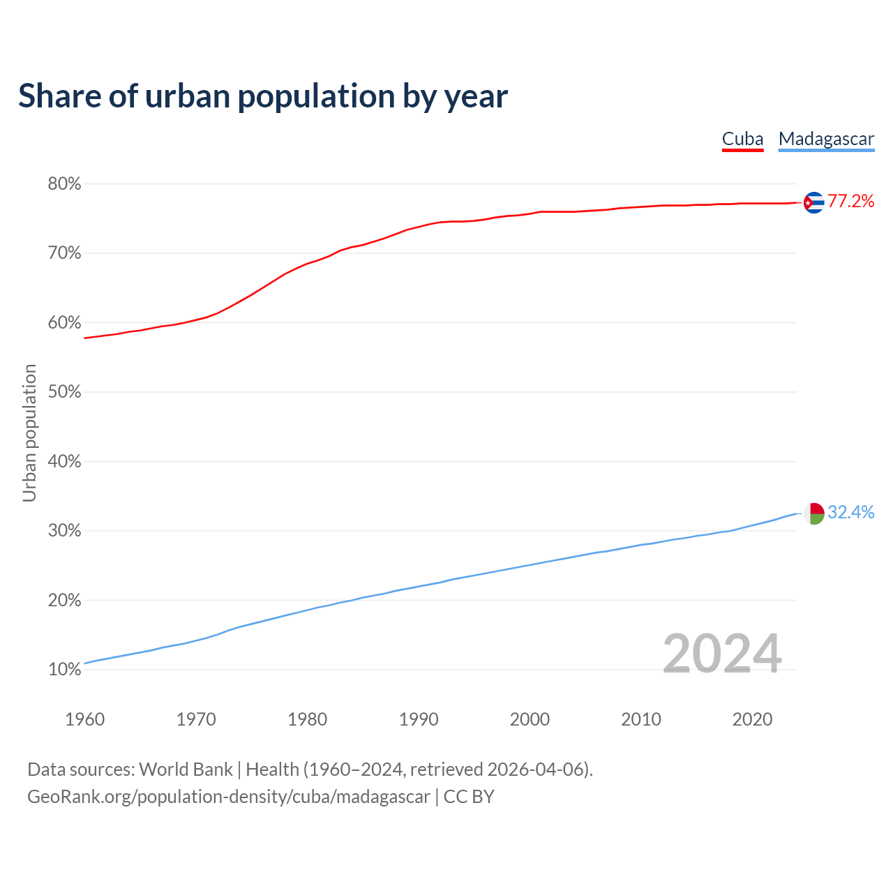 From 2004 to 2024, the share of urban population changed from 75.9% to 77.2% in Cuba and from 26.2% to 32.4% in Madagascar.