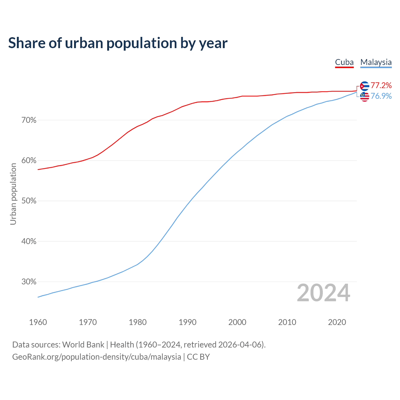 From 2004 to 2024, the share of urban population changed from 75.9% to 77.2% in Cuba and from 66.1% to 76.9% in Malaysia.