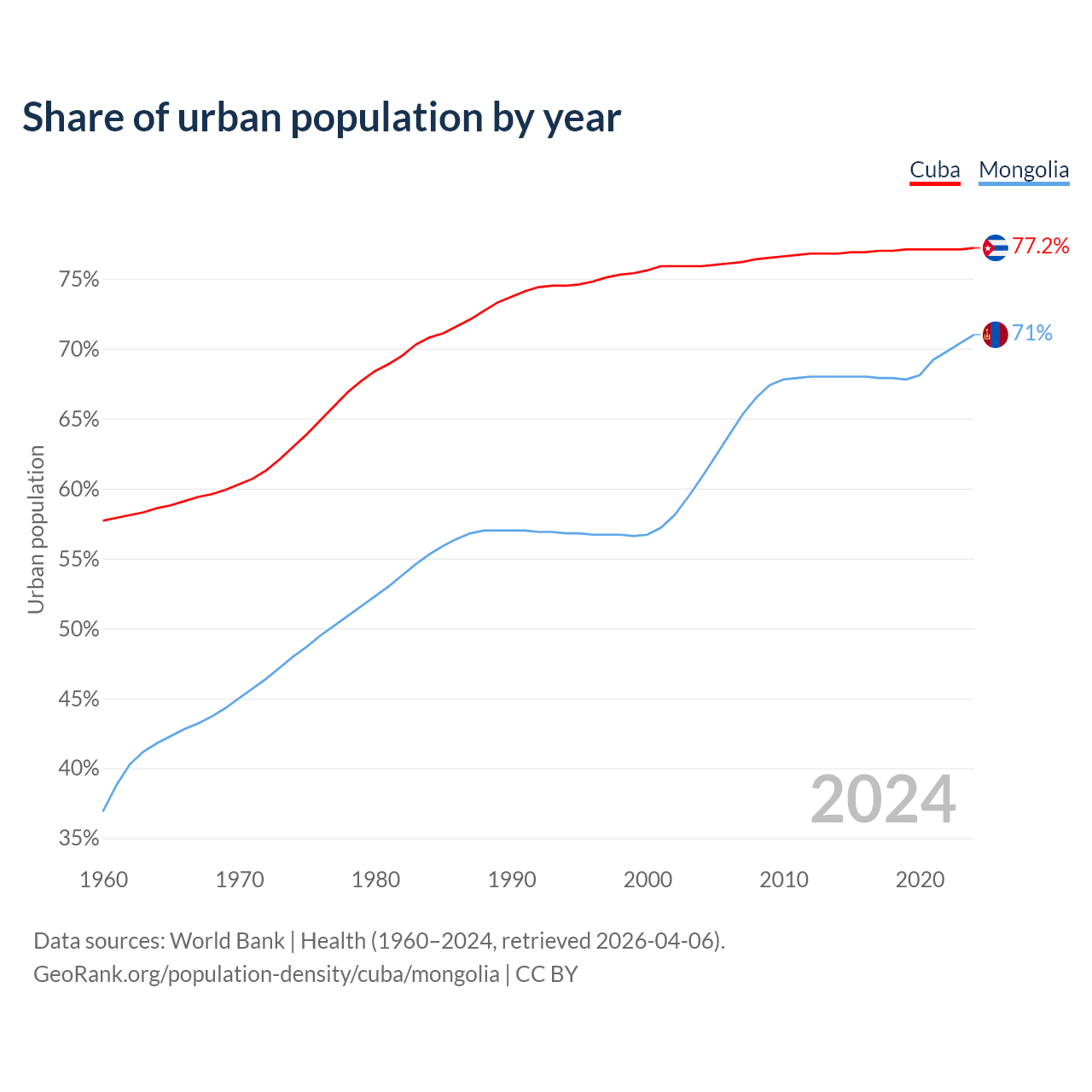 From 2004 to 2024, the share of urban population changed from 75.9% to 77.2% in Cuba and from 60.8% to 71% in Mongolia.