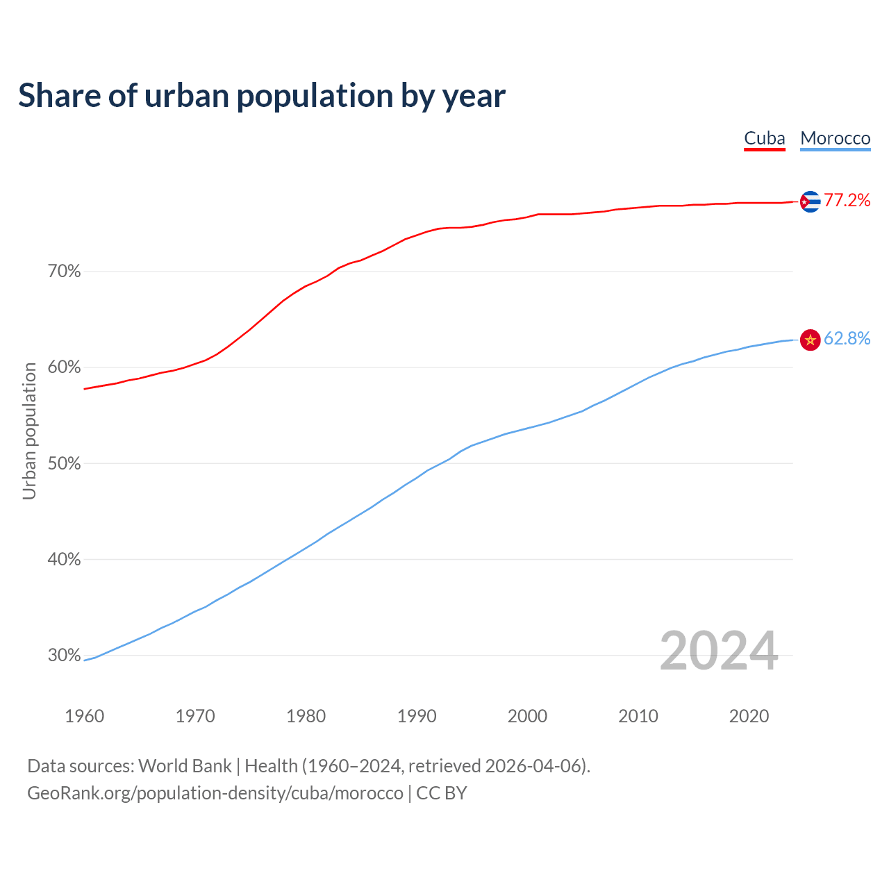From 2004 to 2024, the share of urban population changed from 75.9% to 77.2% in Cuba and from 55% to 62.8% in Morocco.