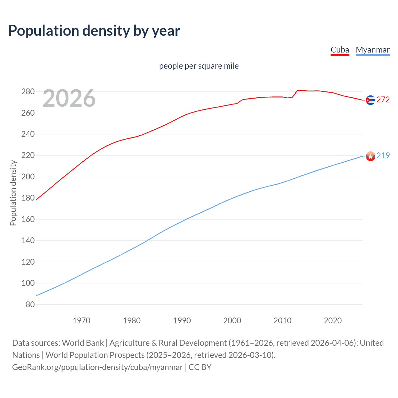 From 2006 to 2026, population density in Cuba decreased by 0.96%, compared to a 15.7% growth in Myanmar.
