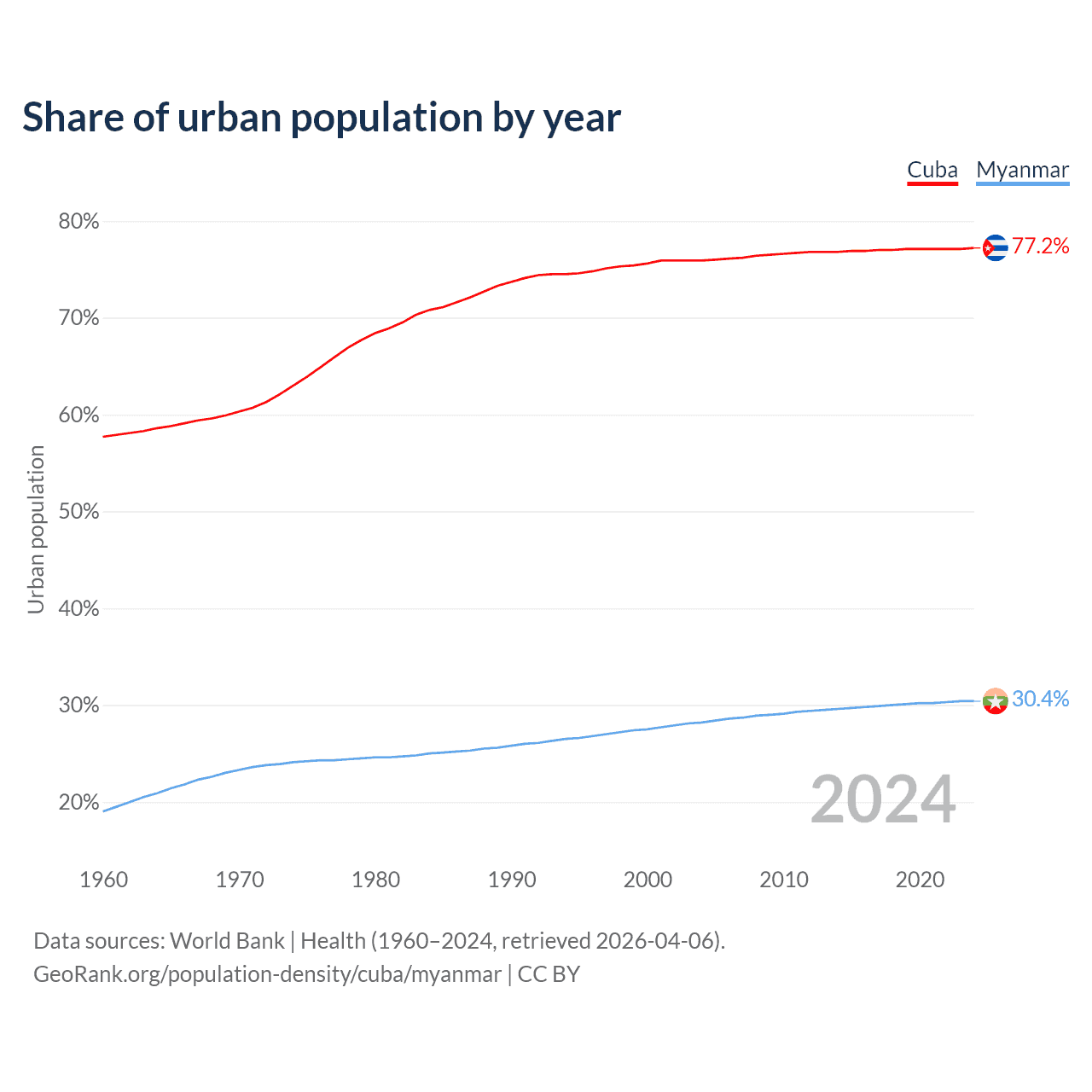 From 2004 to 2024, the share of urban population changed from 75.9% to 77.2% in Cuba and from 28.2% to 30.4% in Myanmar.