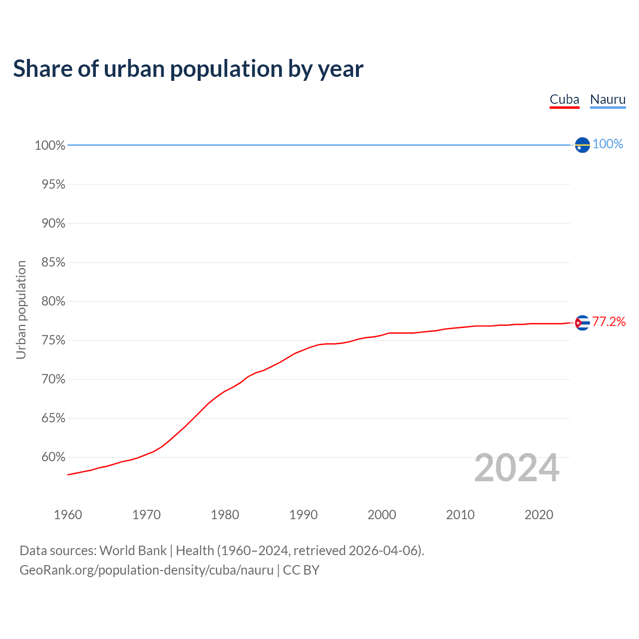 From 2004 to 2024, the share of urban population changed from 75.9% to 77.2% in Cuba and from 100% to 100% in Nauru.