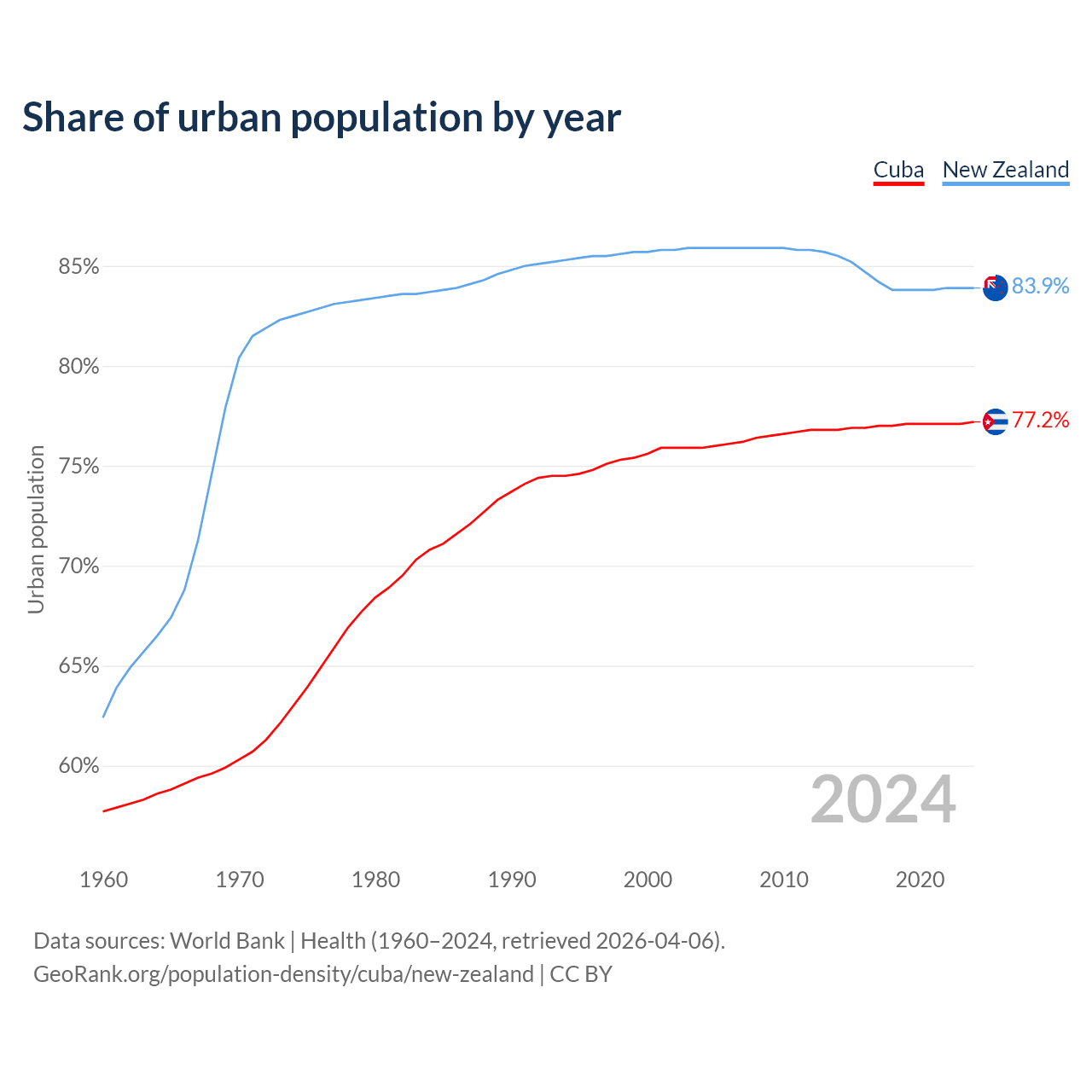 From 2004 to 2024, the share of urban population changed from 75.9% to 77.2% in Cuba and from 85.9% to 83.9% in New Zealand.