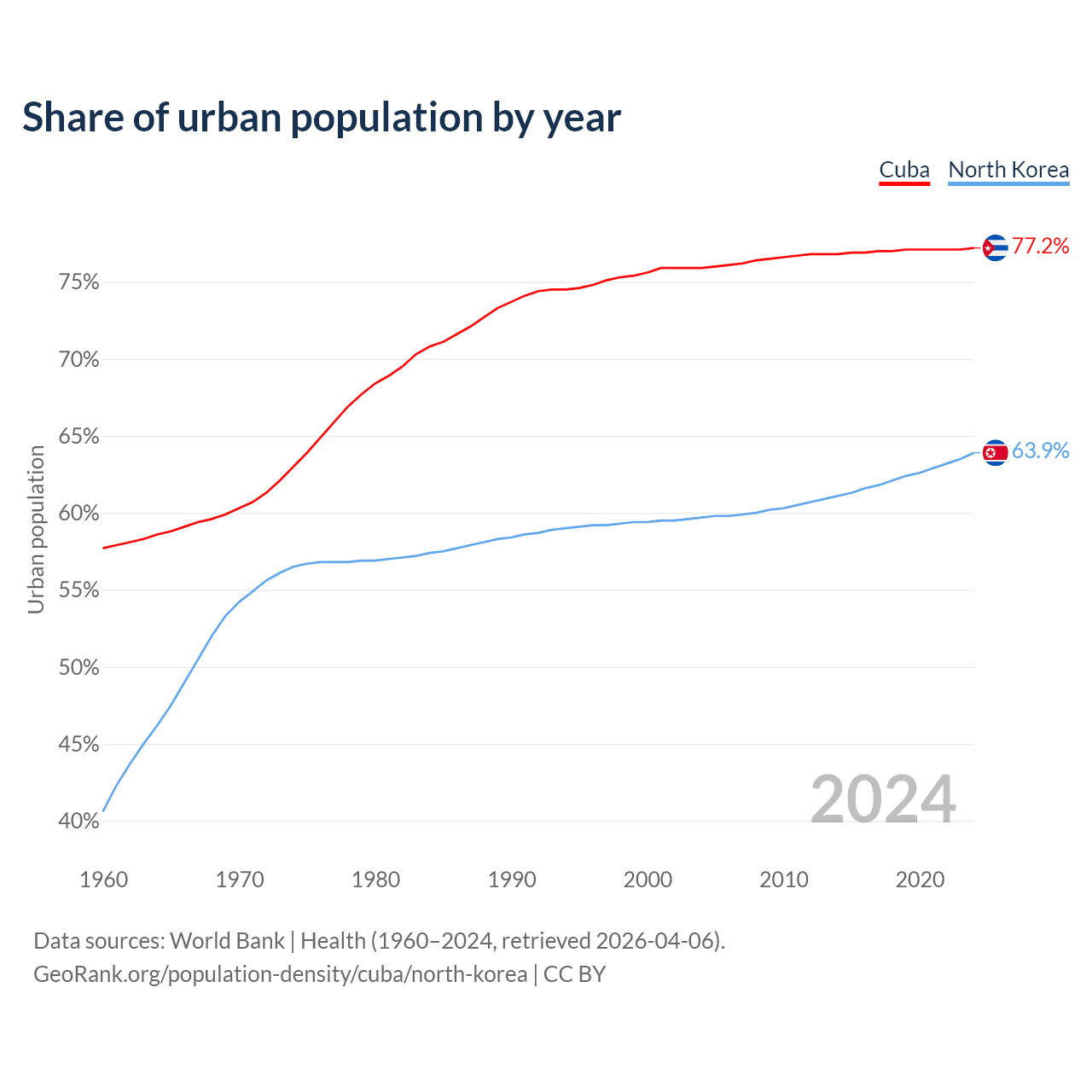 From 2004 to 2024, the share of urban population changed from 75.9% to 77.2% in Cuba and from 59.7% to 63.9% in North Korea.