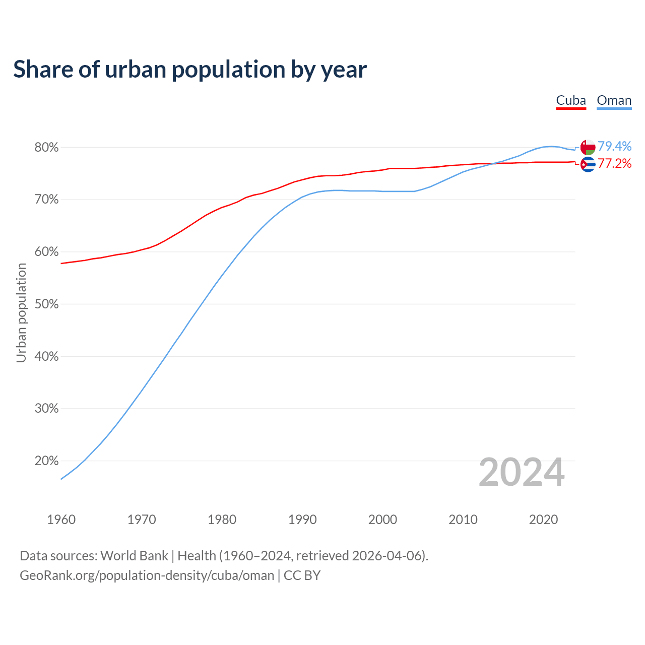 From 2004 to 2024, the share of urban population changed from 75.9% to 77.2% in Cuba and from 71.5% to 79.4% in Oman.