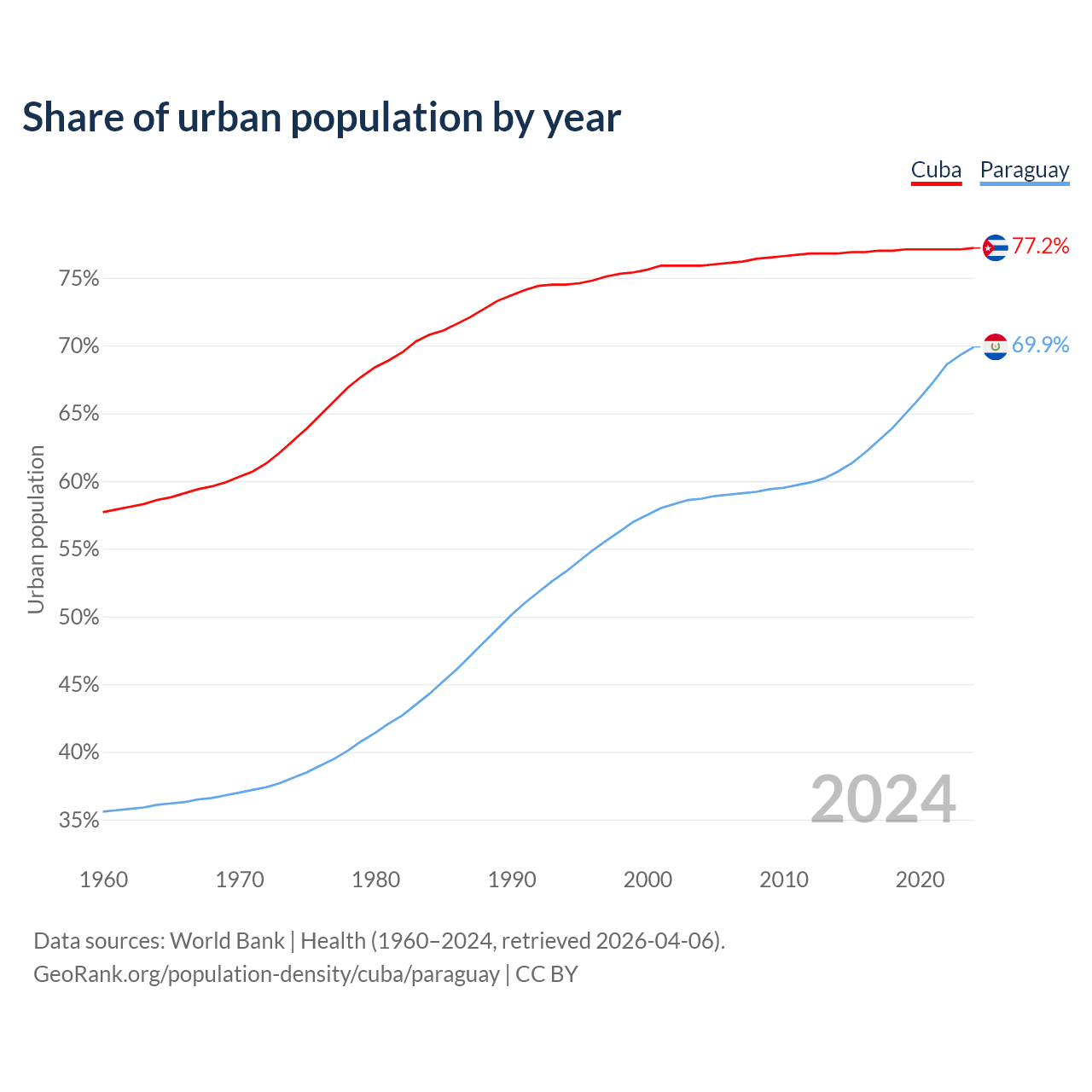 From 2004 to 2024, the share of urban population changed from 75.9% to 77.2% in Cuba and from 58.7% to 69.9% in Paraguay.
