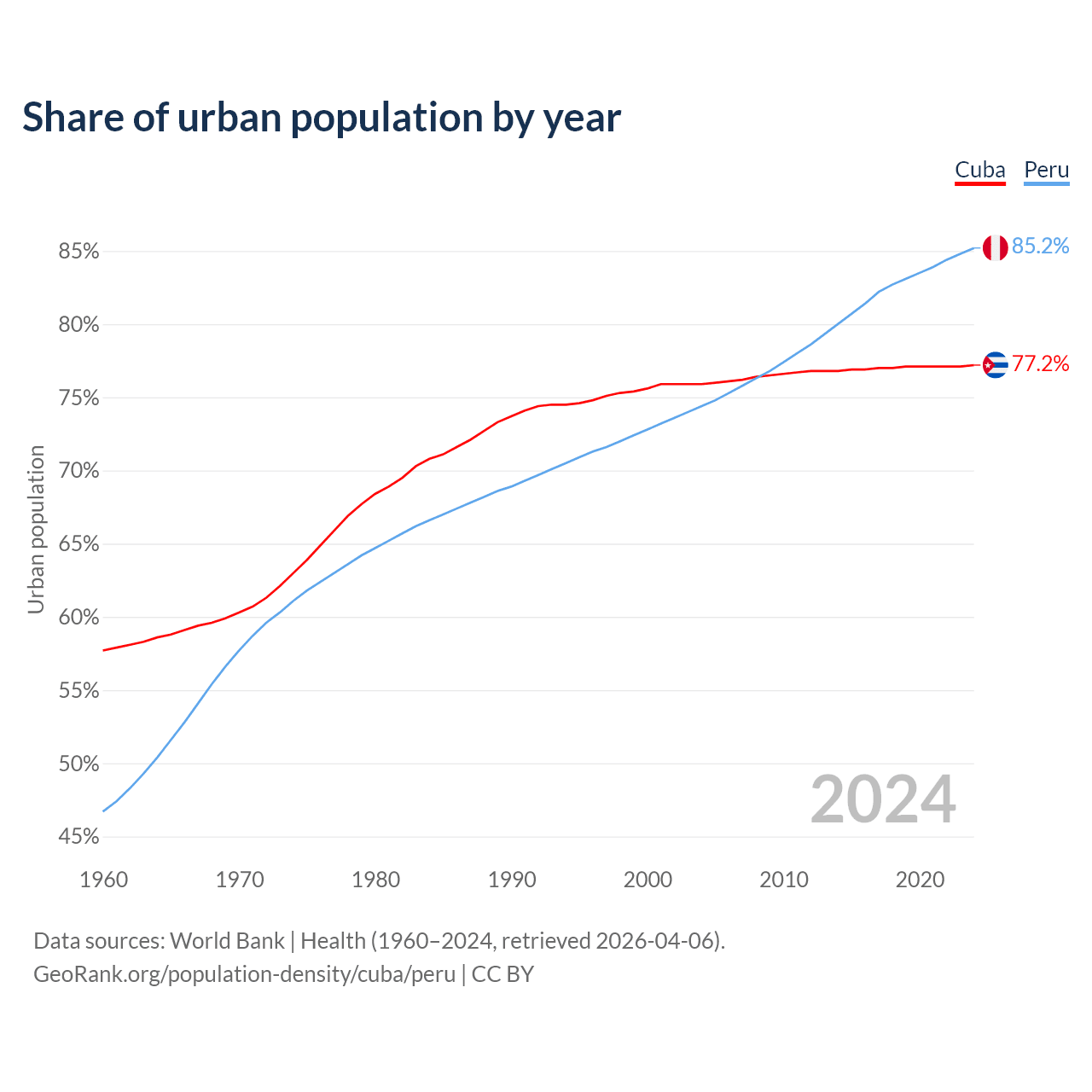 From 2004 to 2024, the share of urban population changed from 75.9% to 77.2% in Cuba and from 74.4% to 85.2% in Peru.