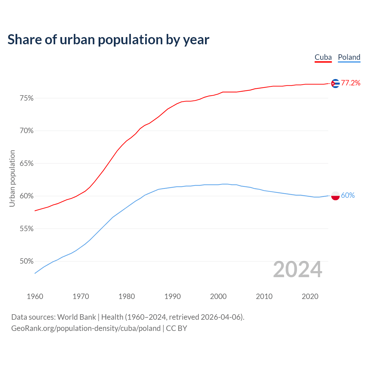 From 2004 to 2024, the share of urban population changed from 75.9% to 77.2% in Cuba and from 61.7% to 60% in Poland.