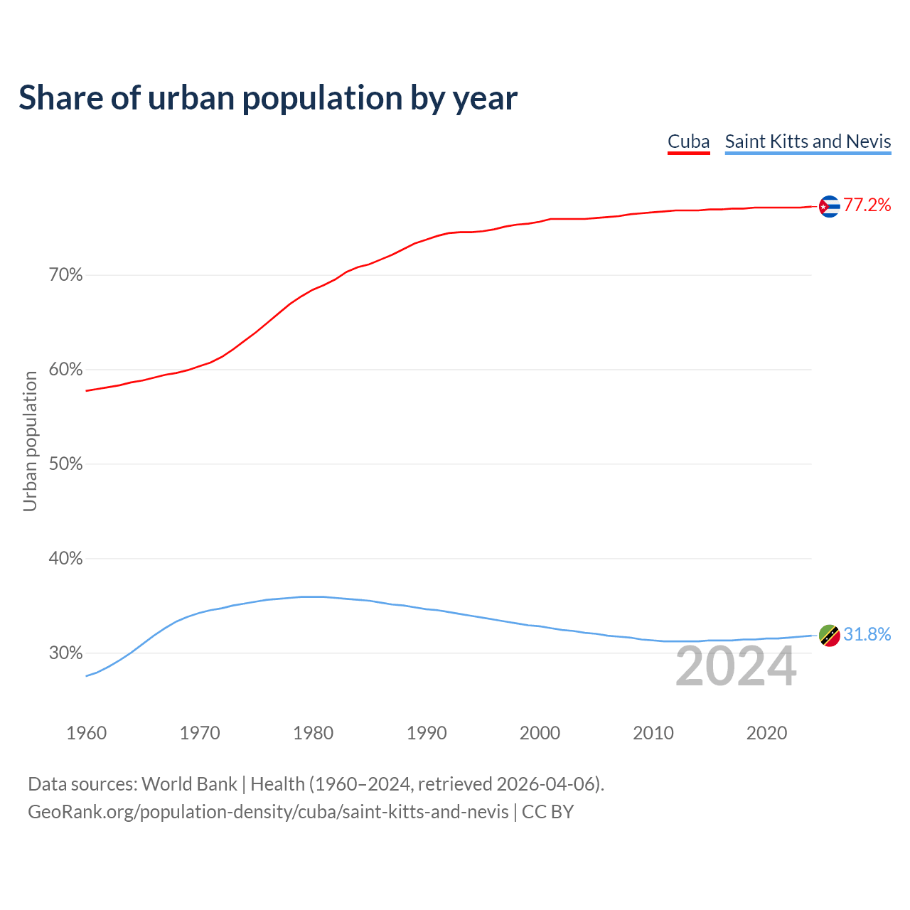 From 2004 to 2024, the share of urban population changed from 75.9% to 77.2% in Cuba and from 32.1% to 31.8% in Saint Kitts and Nevis.