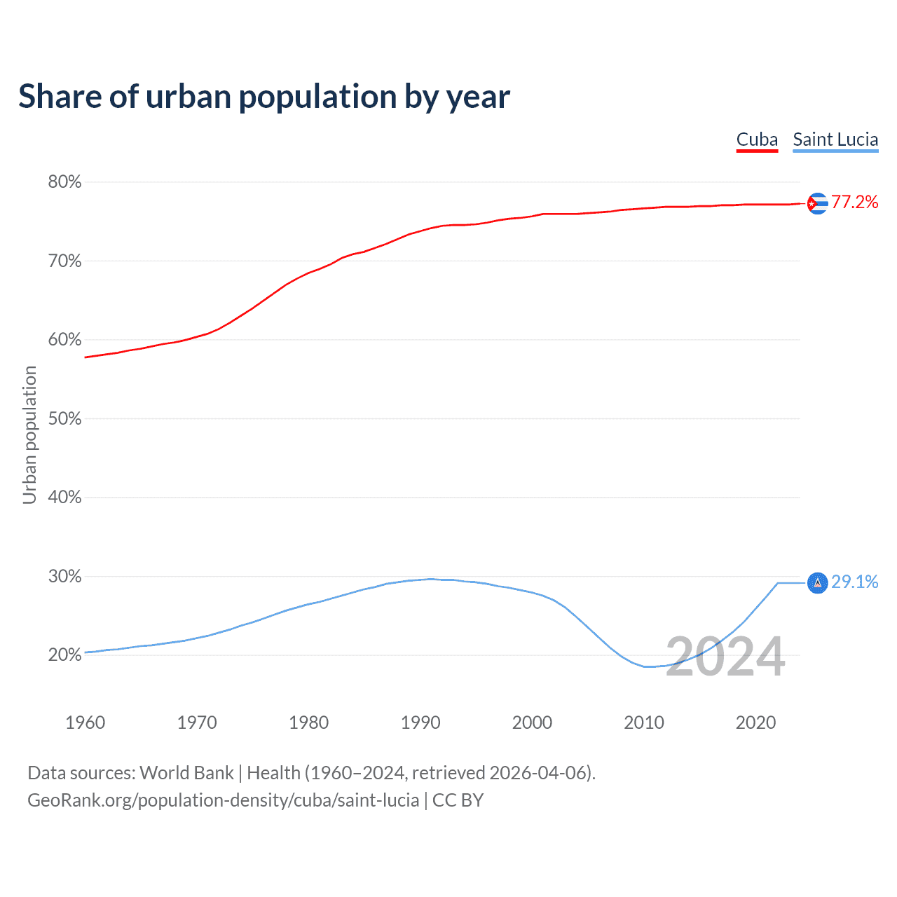 From 2004 to 2024, the share of urban population changed from 75.9% to 77.2% in Cuba and from 24.8% to 29.1% in Saint Lucia.