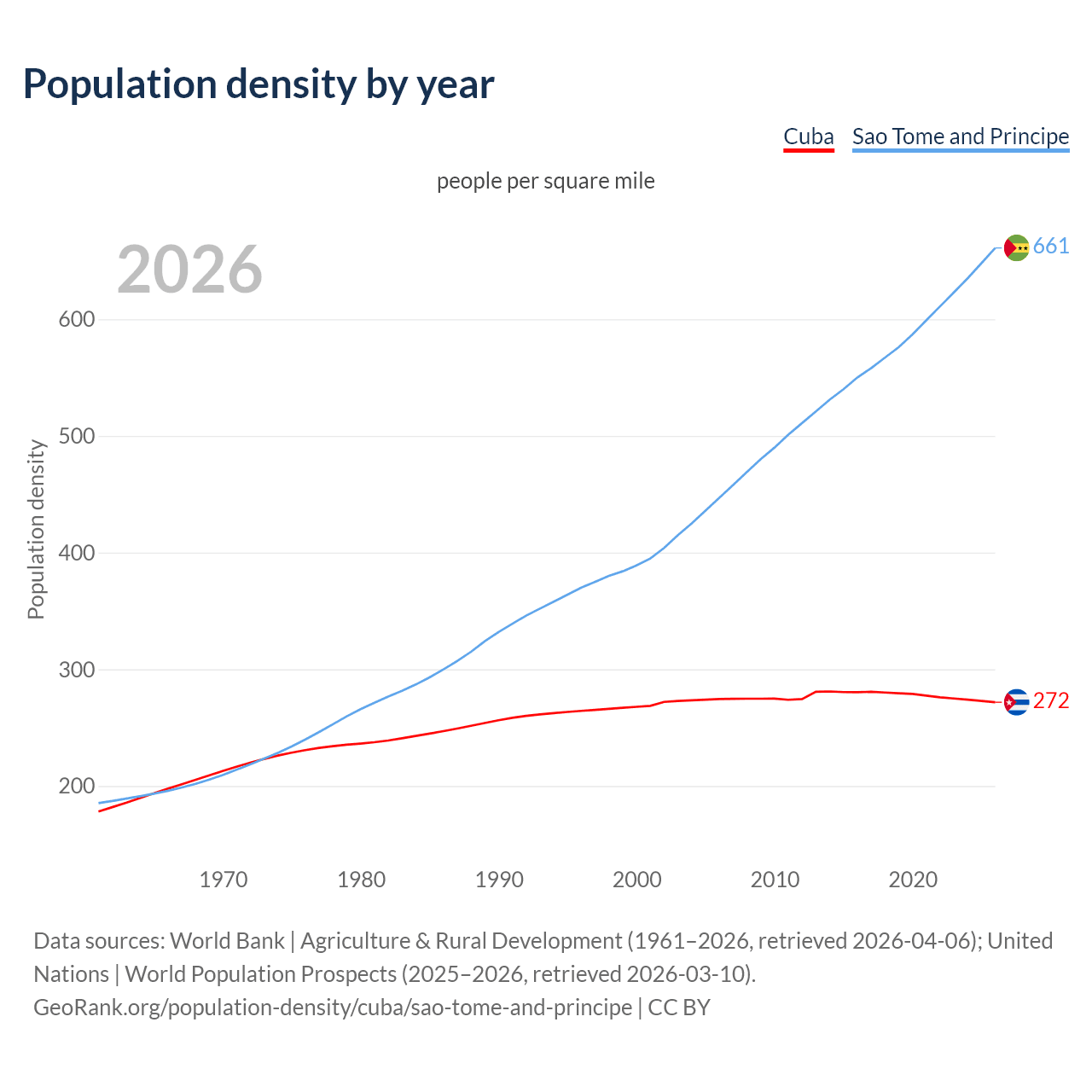 From 2006 to 2026, population density in Cuba decreased by 0.96%, compared to a 48% growth in Sao Tome and Principe.