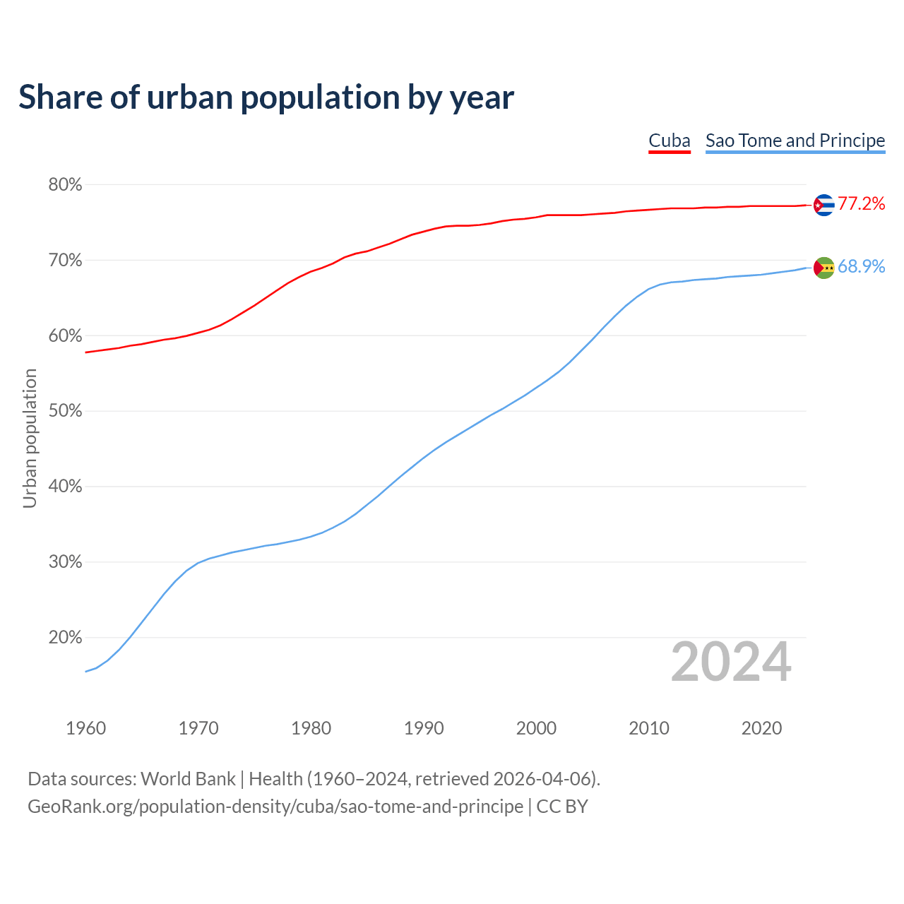 From 2004 to 2024, the share of urban population changed from 75.9% to 77.2% in Cuba and from 57.9% to 68.9% in Sao Tome and Principe.