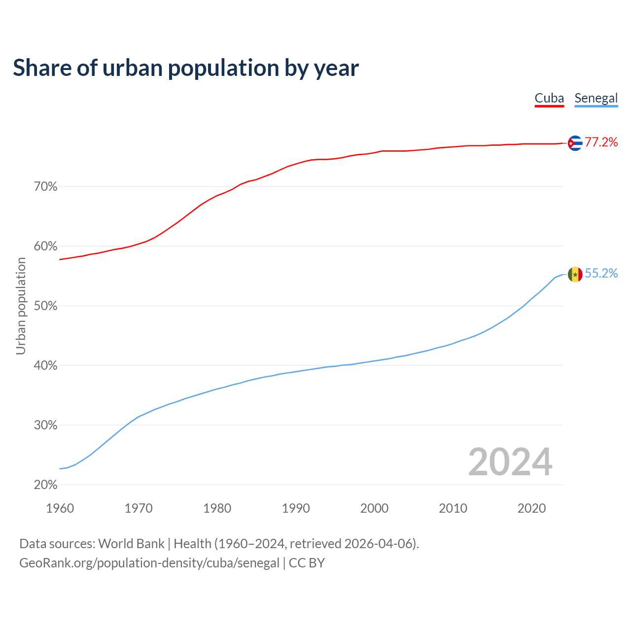 From 2004 to 2024, the share of urban population changed from 75.9% to 77.2% in Cuba and from 41.6% to 55.2% in Senegal.