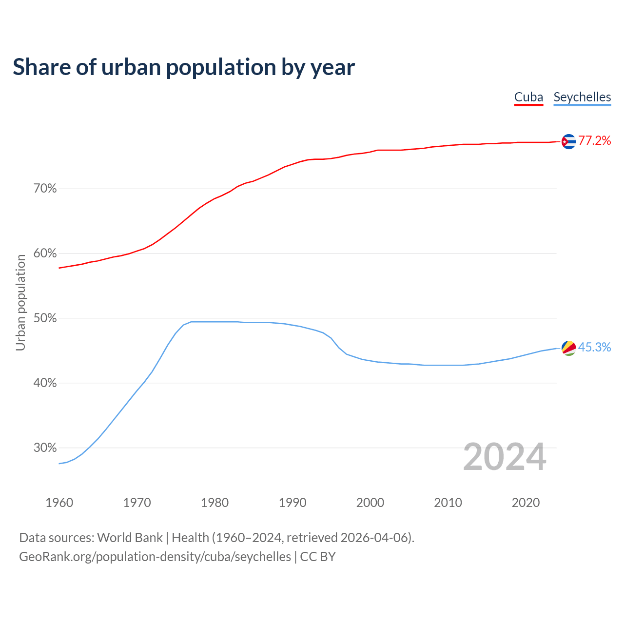 From 2004 to 2024, the share of urban population changed from 75.9% to 77.2% in Cuba and from 42.9% to 45.3% in the Seychelles.