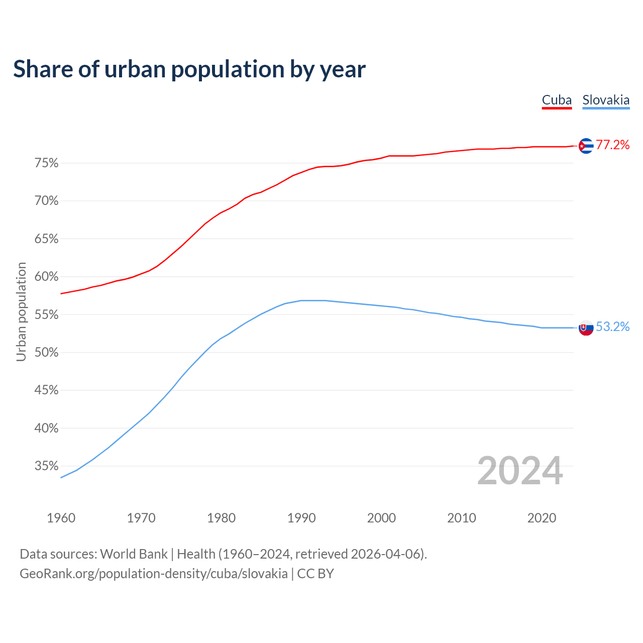 From 2004 to 2024, the share of urban population changed from 75.9% to 77.2% in Cuba and from 55.6% to 53.2% in Slovakia.