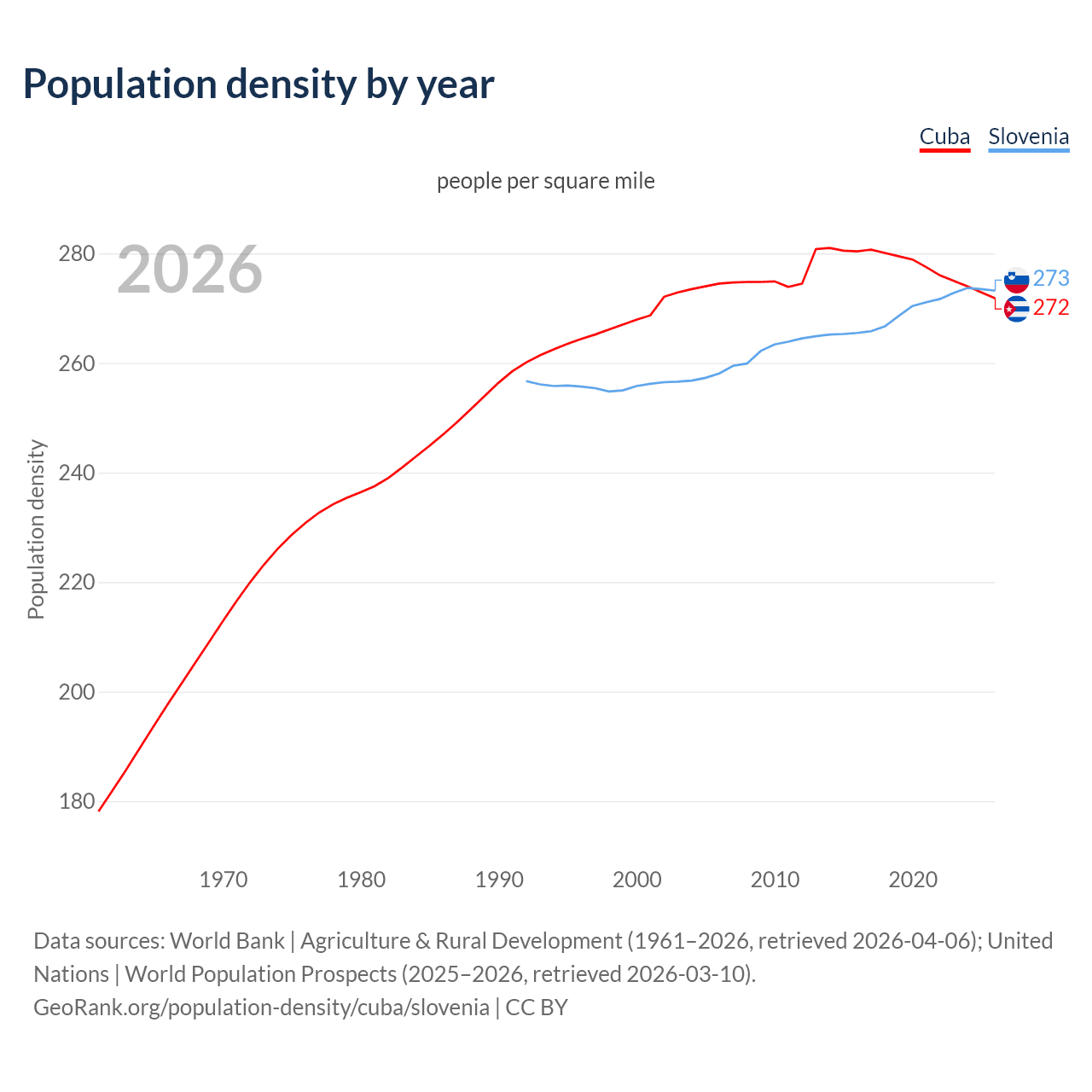 From 2006 to 2026, population density in Cuba decreased by 0.96%, compared to a 5.87% growth in Slovenia.
