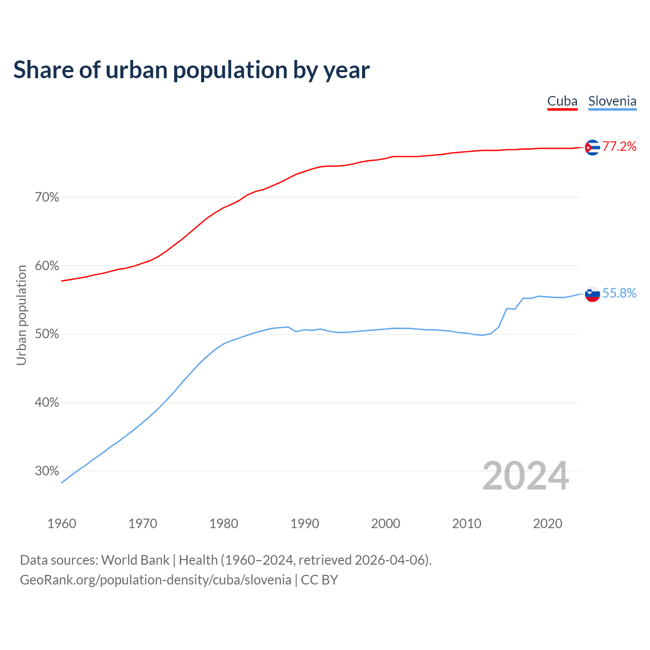 From 2004 to 2024, the share of urban population changed from 75.9% to 77.2% in Cuba and from 50.7% to 55.8% in Slovenia.