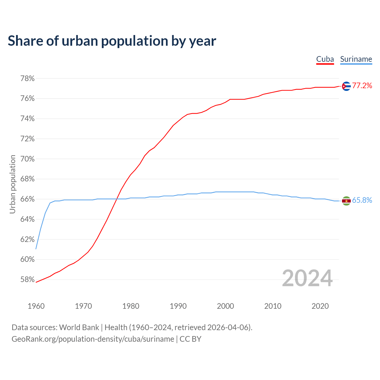 From 2004 to 2024, the share of urban population changed from 75.9% to 77.2% in Cuba and from 66.7% to 65.8% in Suriname.