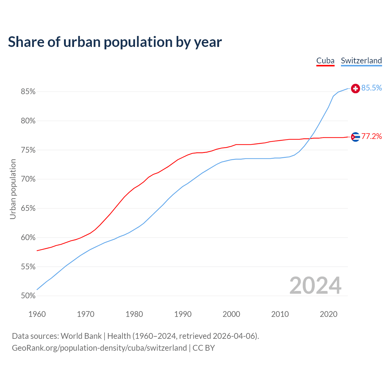 From 2004 to 2024, the share of urban population changed from 75.9% to 77.2% in Cuba and from 73.5% to 85.5% in Switzerland.