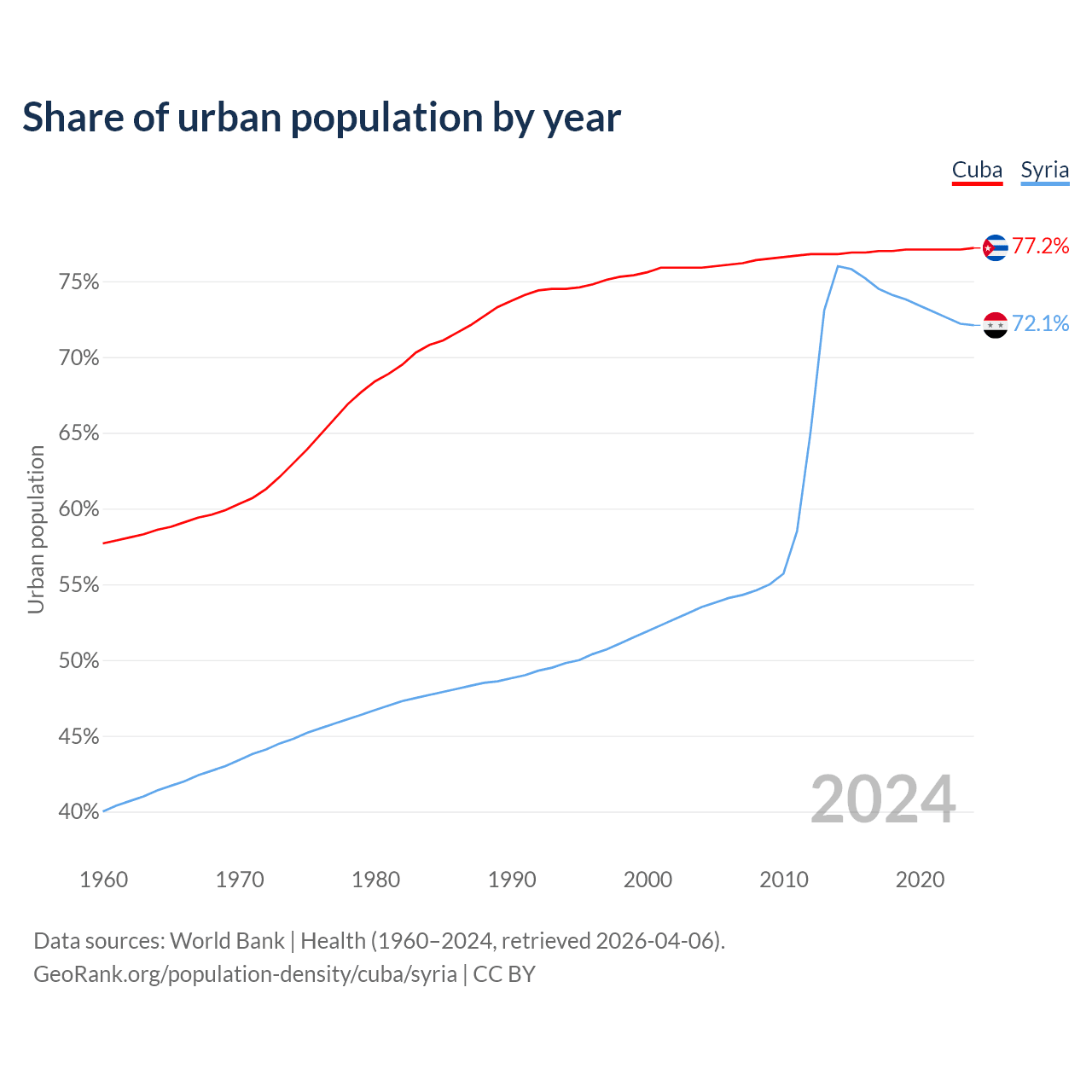 From 2004 to 2024, the share of urban population changed from 75.9% to 77.2% in Cuba and from 53.5% to 72.1% in Syria.