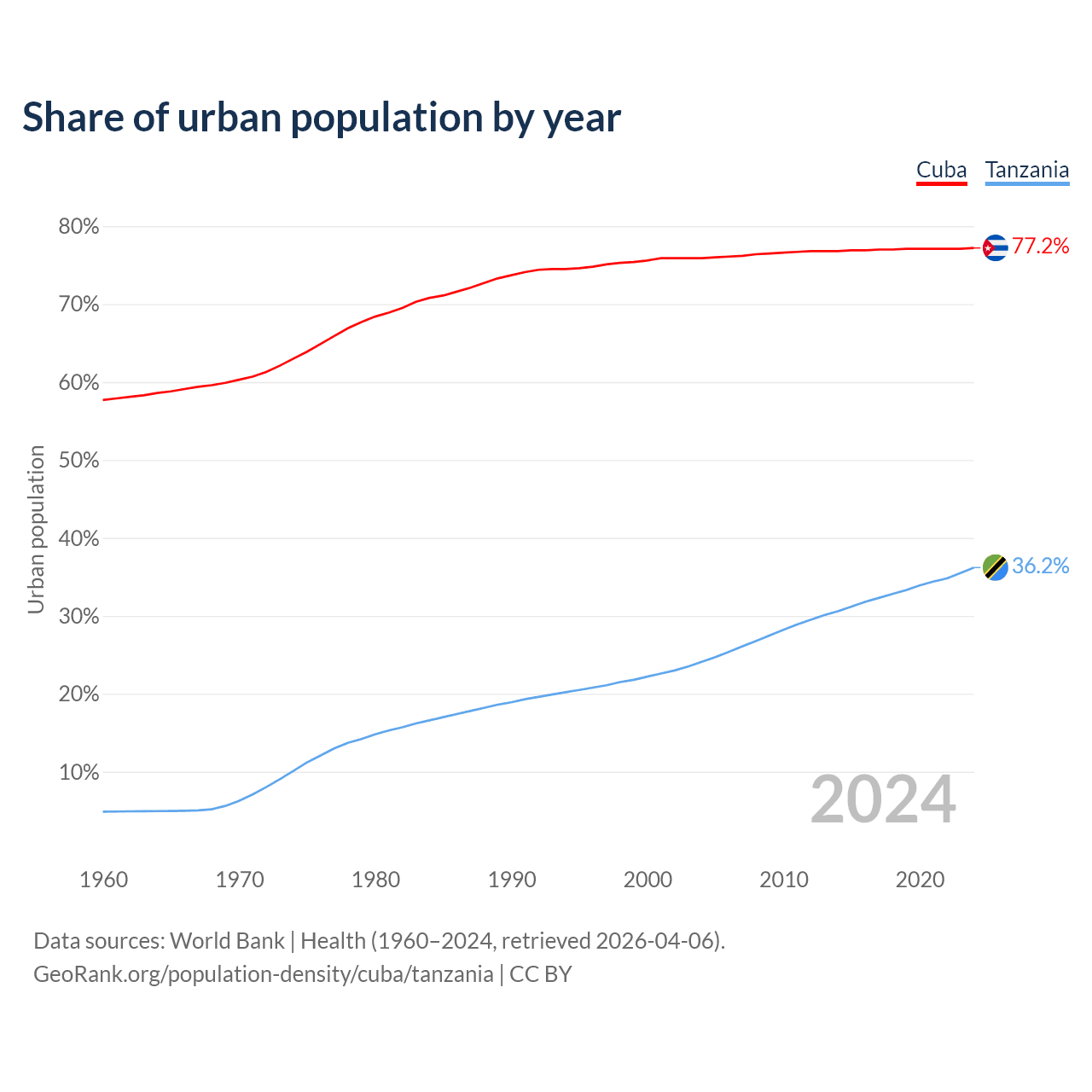 From 2004 to 2024, the share of urban population changed from 75.9% to 77.2% in Cuba and from 24.1% to 36.2% in Tanzania.