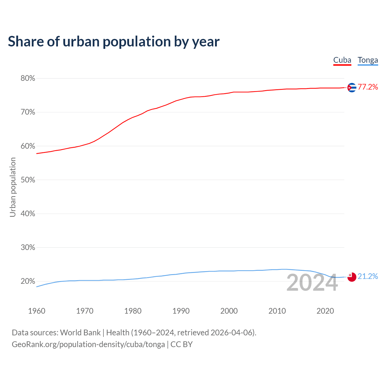 From 2004 to 2024, the share of urban population changed from 75.9% to 77.2% in Cuba and from 23.1% to 21.2% in Tonga.