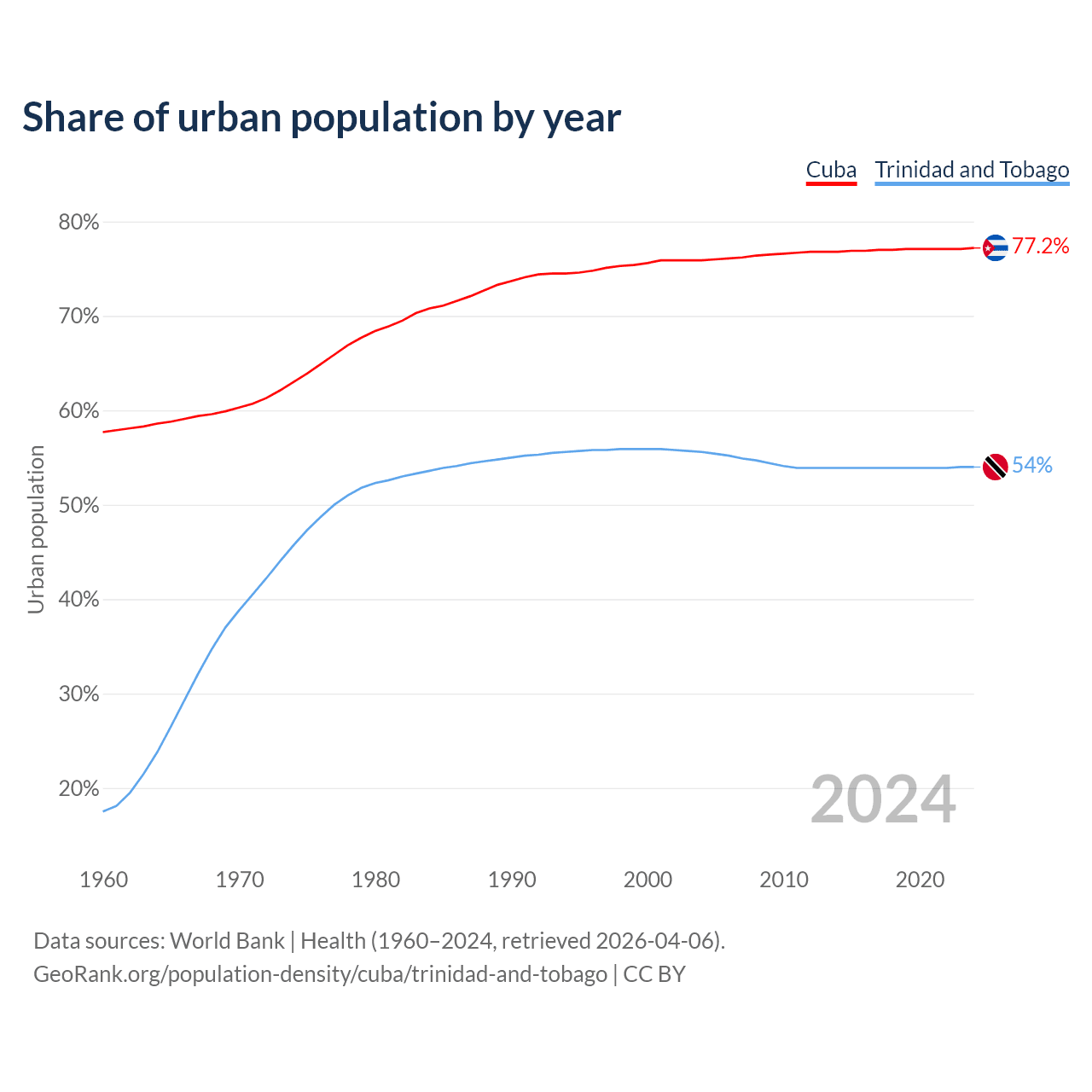 From 2004 to 2024, the share of urban population changed from 75.9% to 77.2% in Cuba and from 55.6% to 54% in Trinidad and Tobago.