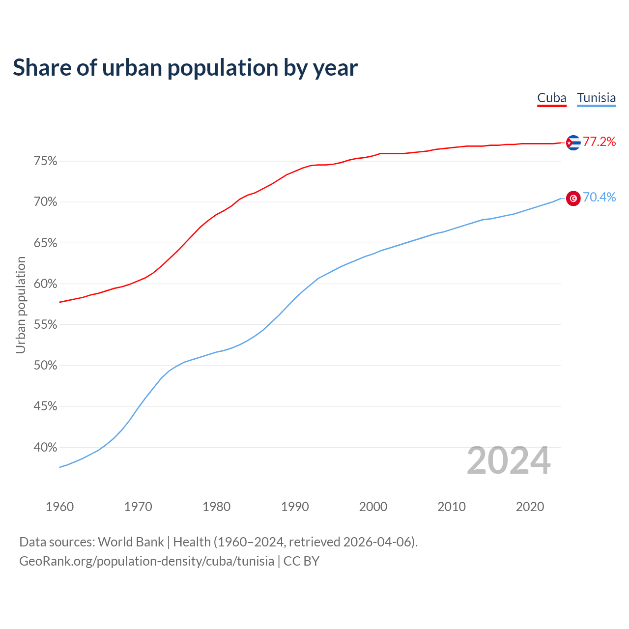 From 2004 to 2024, the share of urban population changed from 75.9% to 77.2% in Cuba and from 64.9% to 70.4% in Tunisia.