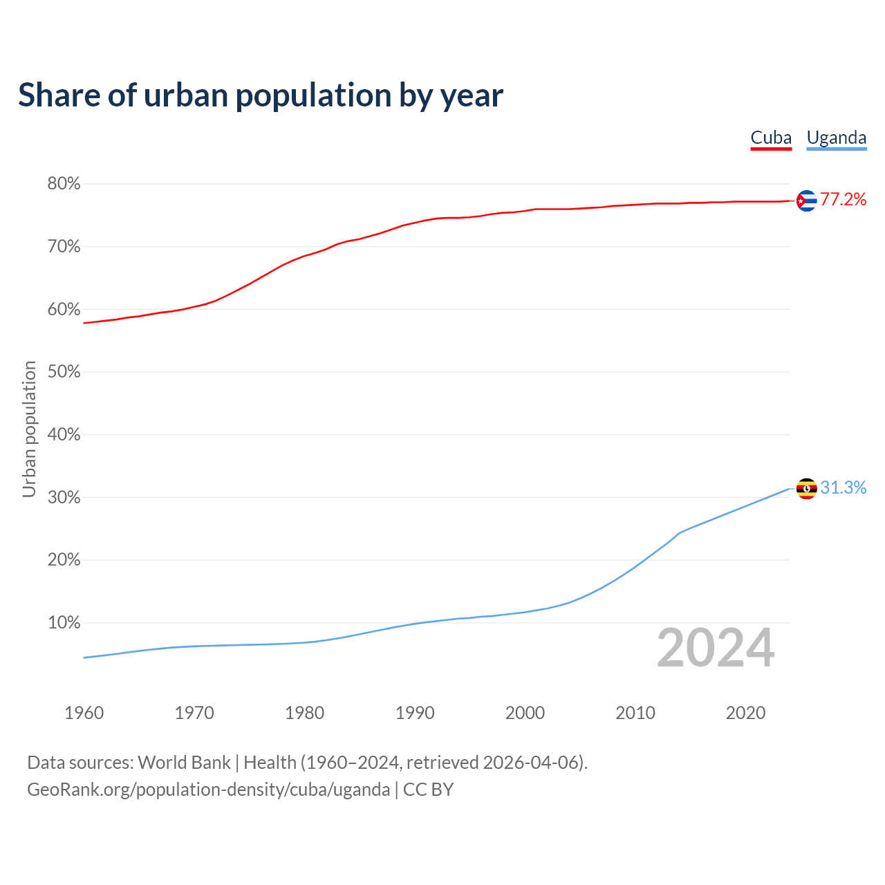 From 2004 to 2024, the share of urban population changed from 75.9% to 77.2% in Cuba and from 13.1% to 31.3% in Uganda.