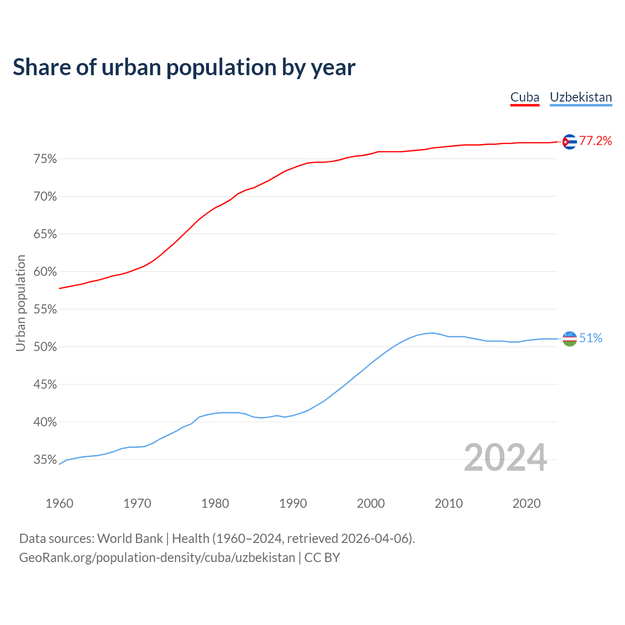 From 2004 to 2024, the share of urban population changed from 75.9% to 77.2% in Cuba and from 50.6% to 51% in Uzbekistan.