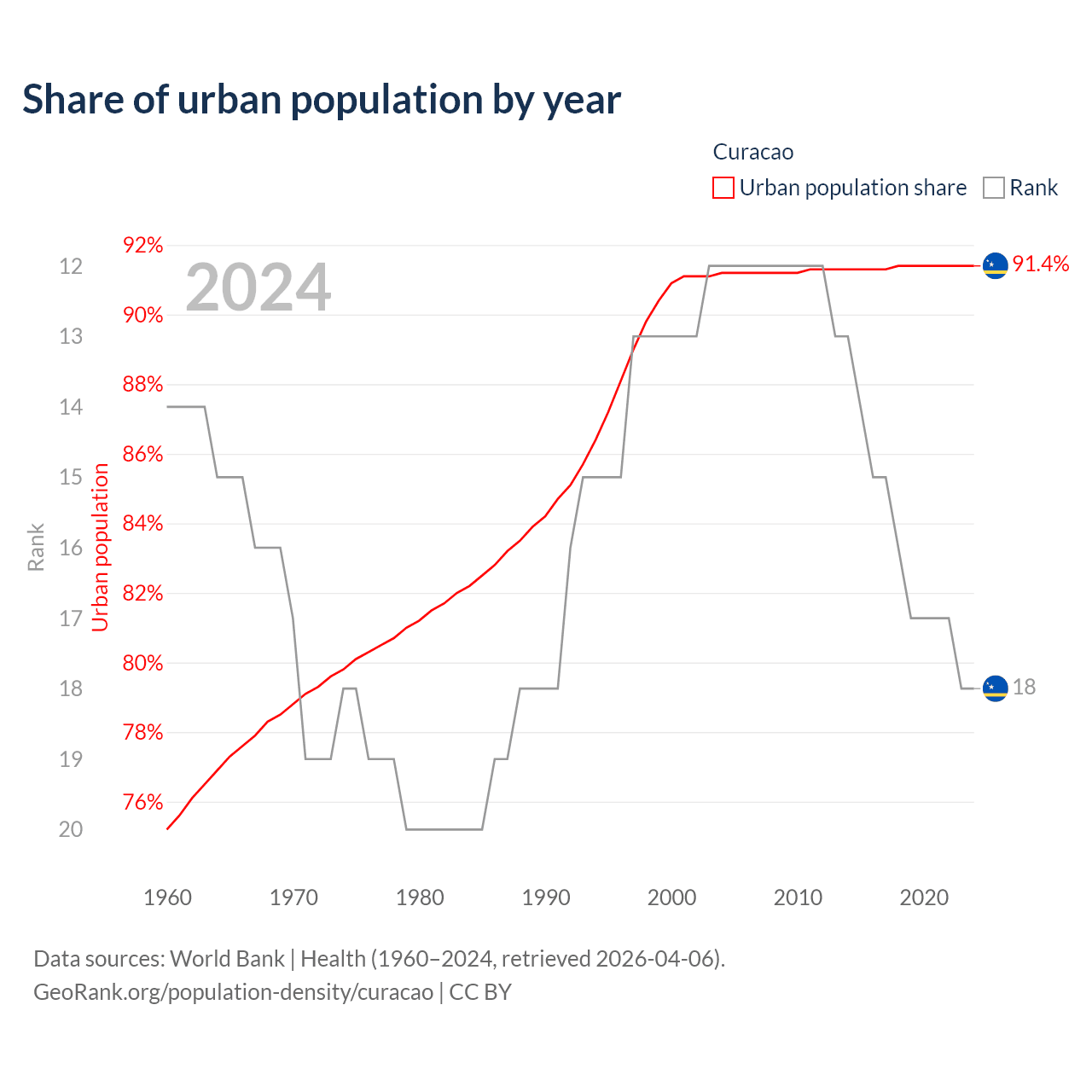 This chart shows the share of urban population in Curacao from 1960 to 2024: 75.2% lived in urban areas in 1960, 90.9% in 2000, and 91.4% in 2024.