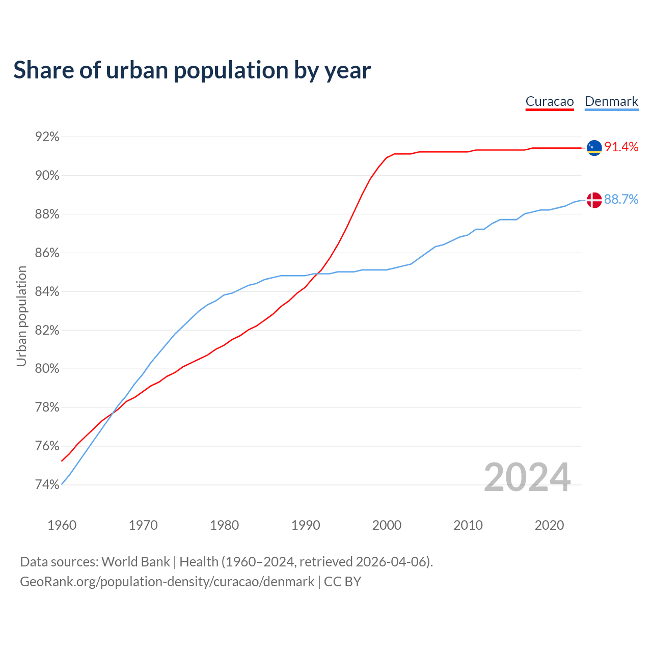 From 2004 to 2024, the share of urban population changed from 91.2% to 91.4% in Curacao and from 85.7% to 88.7% in Denmark.