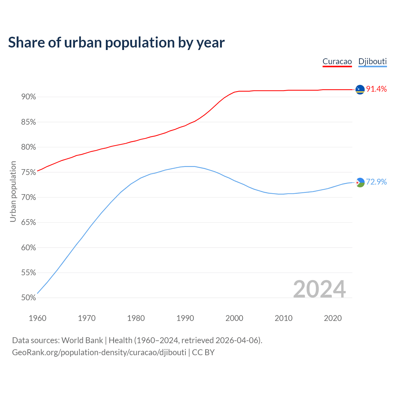 From 2004 to 2024, the share of urban population changed from 91.2% to 91.4% in Curacao and from 71.6% to 72.9% in Djibouti.