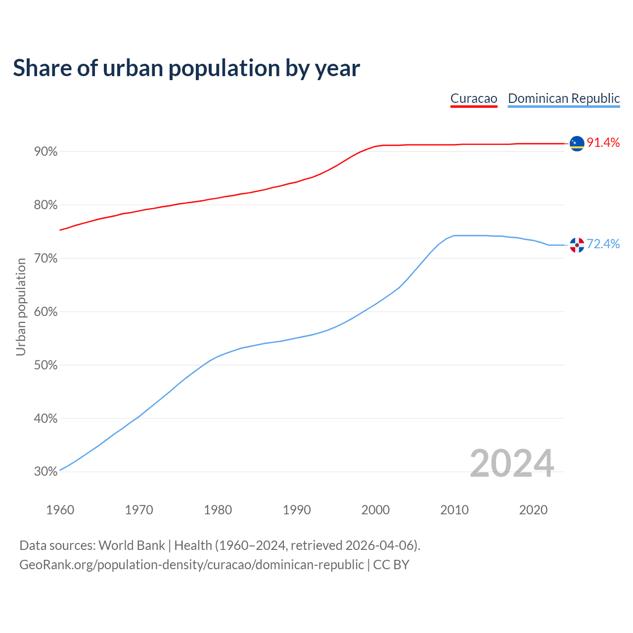 From 2004 to 2024, the share of urban population changed from 91.2% to 91.4% in Curacao and from 65.9% to 72.4% in the Dominican Republic.