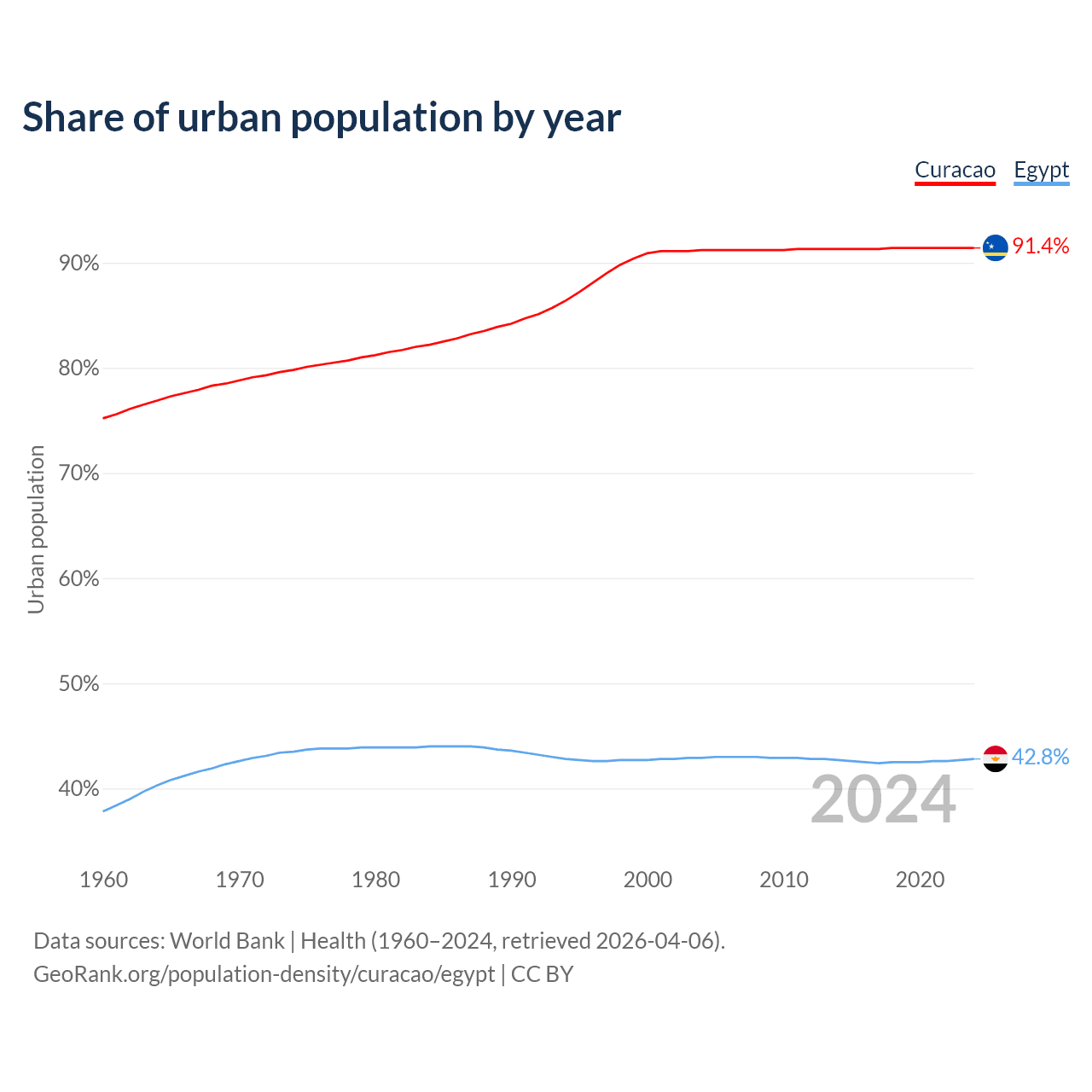 From 2004 to 2024, the share of urban population changed from 91.2% to 91.4% in Curacao and from 42.9% to 42.8% in Egypt.