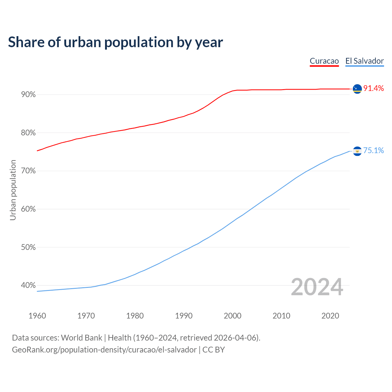 From 2004 to 2024, the share of urban population changed from 91.2% to 91.4% in Curacao and from 60.1% to 75.1% in El Salvador.