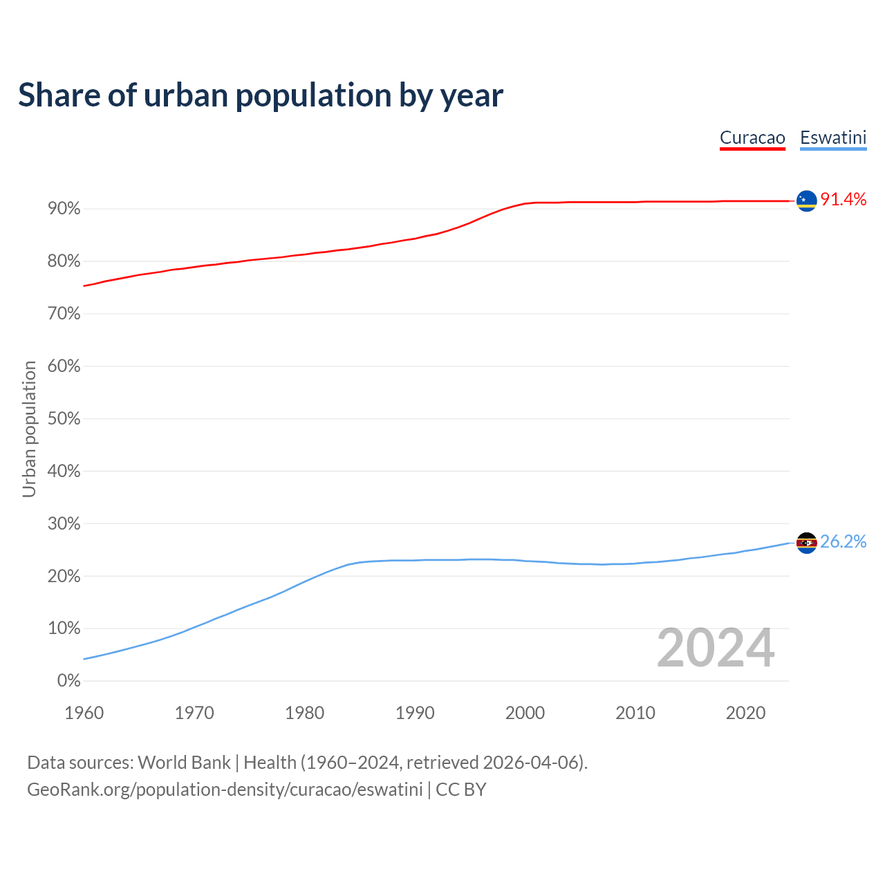 From 2004 to 2024, the share of urban population changed from 91.2% to 91.4% in Curacao and from 22.3% to 26.2% in Eswatini.