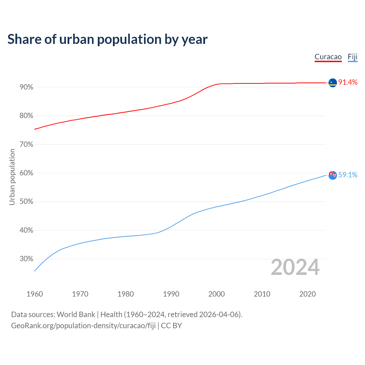 From 2004 to 2024, the share of urban population changed from 91.2% to 91.4% in Curacao and from 49.5% to 59.1% in Fiji.