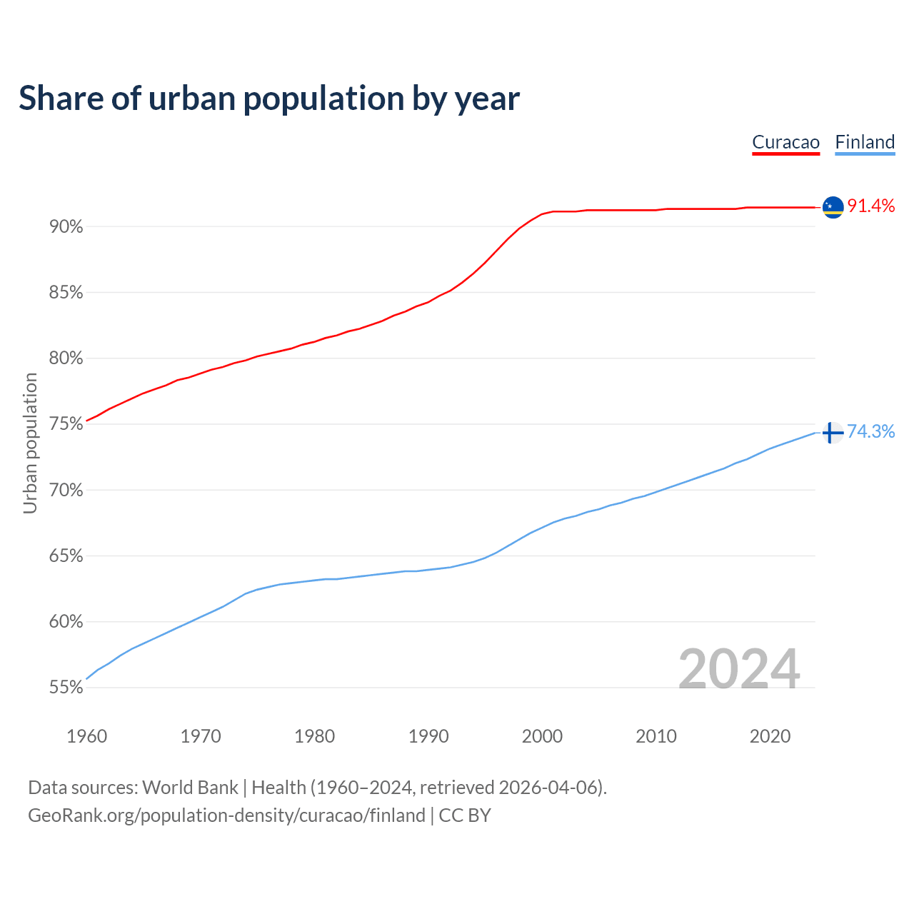 From 2004 to 2024, the share of urban population changed from 91.2% to 91.4% in Curacao and from 68.3% to 74.3% in Finland.
