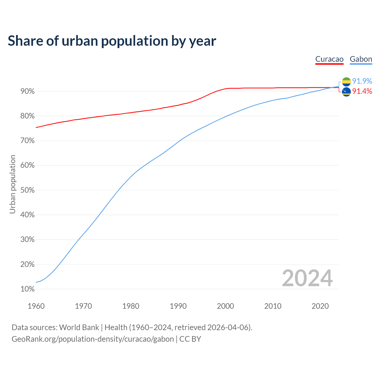 From 2004 to 2024, the share of urban population changed from 91.2% to 91.4% in Curacao and from 82.7% to 91.9% in Gabon.