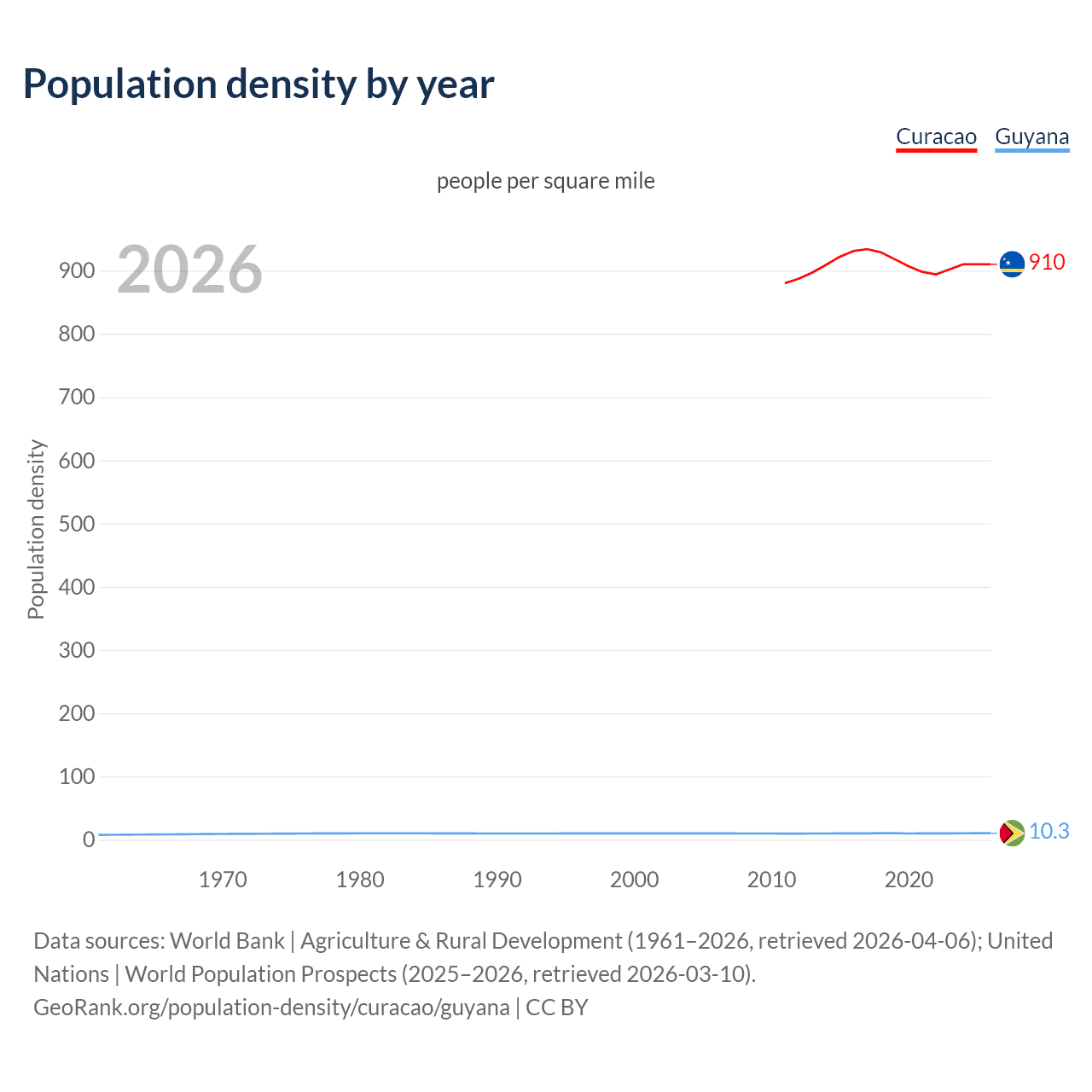 From 2011 to 2026, population density in Curacao increased by 3.41%, compared to a 5.07% growth in Guyana.