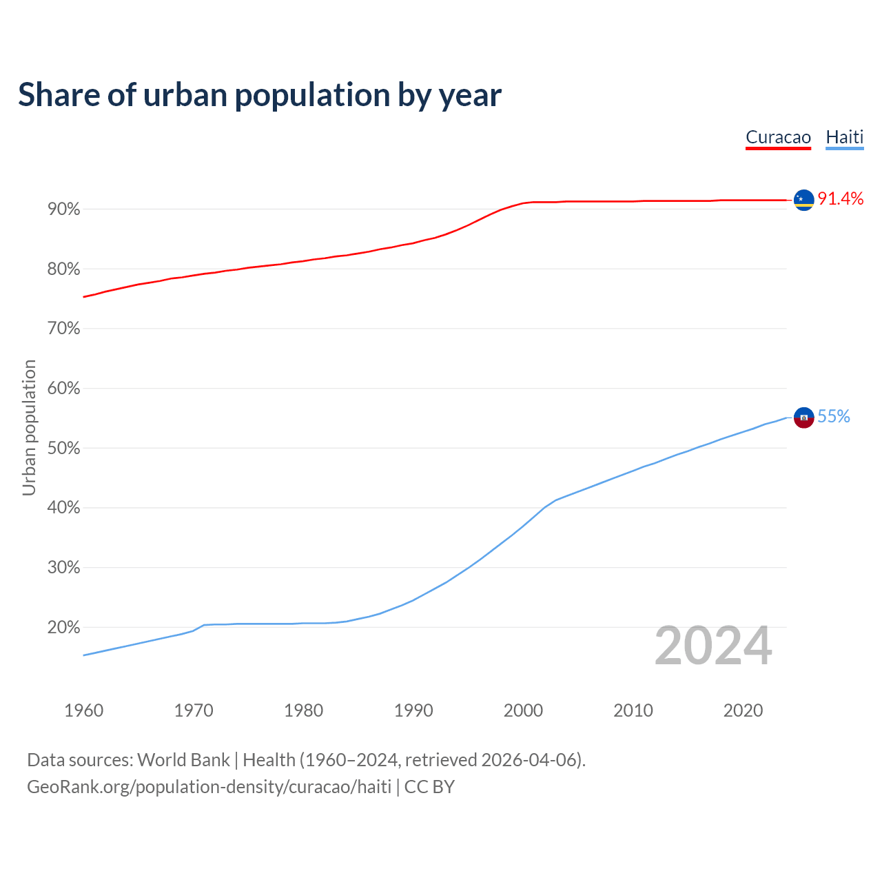 From 2004 to 2024, the share of urban population changed from 91.2% to 91.4% in Curacao and from 41.9% to 55% in Haiti.