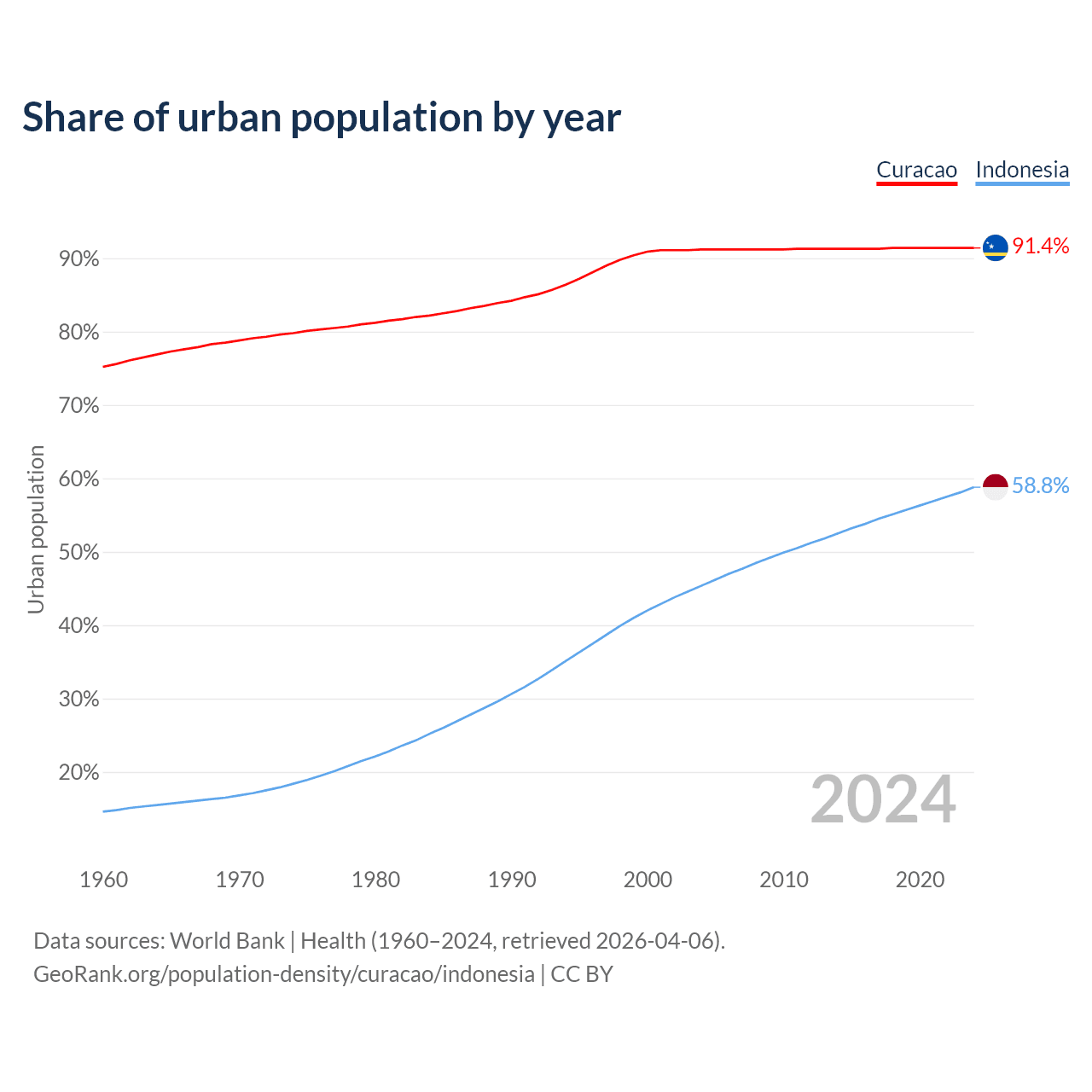 From 2004 to 2024, the share of urban population changed from 91.2% to 91.4% in Curacao and from 45.4% to 58.8% in Indonesia.